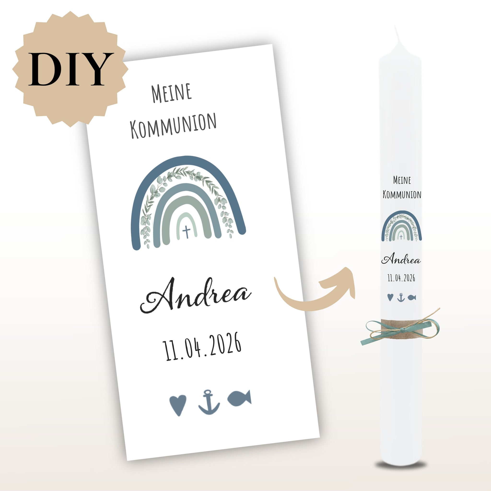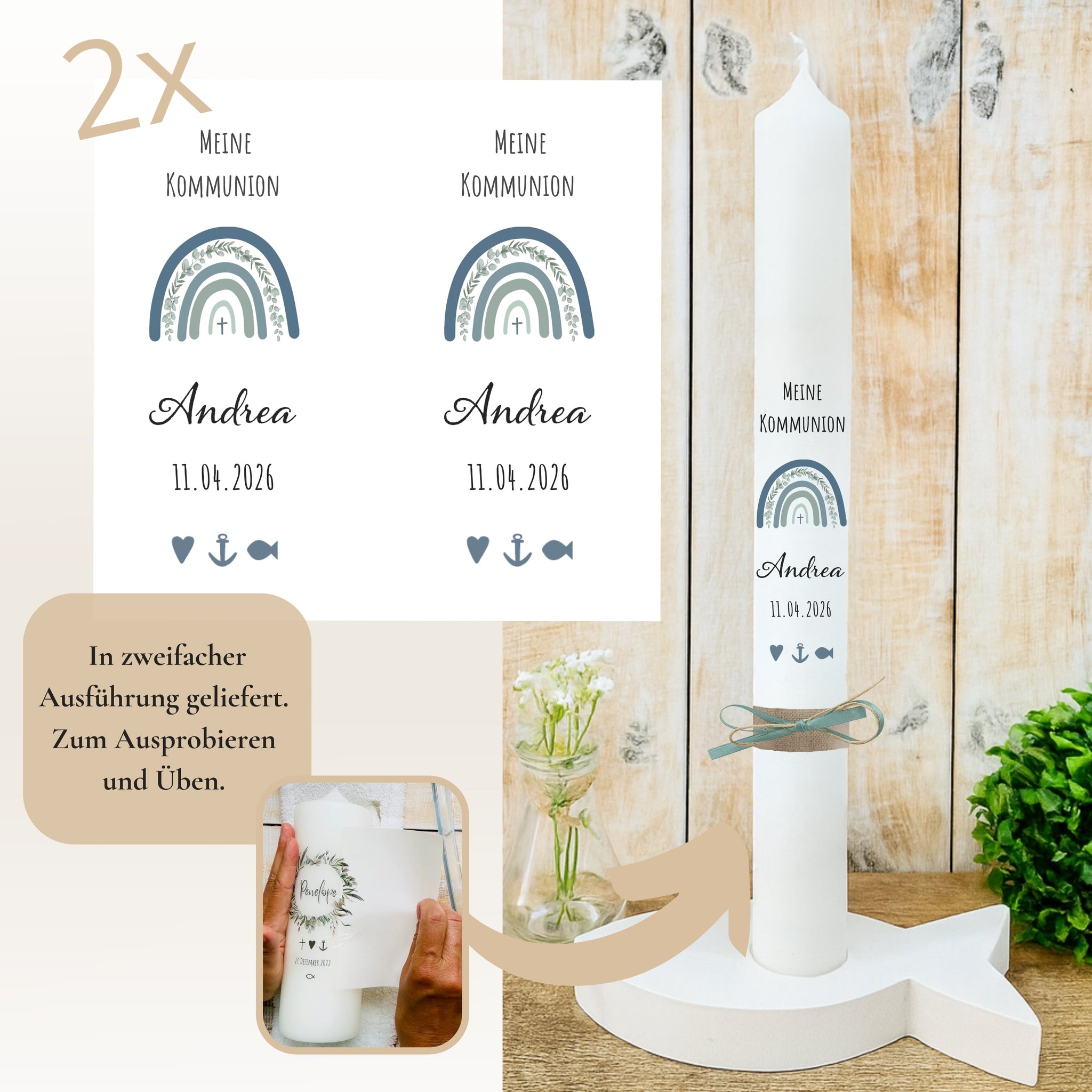 Kerzenfolie Kommunionkerze "Andrea" Eukalyptus Regenbogen - personalisiert