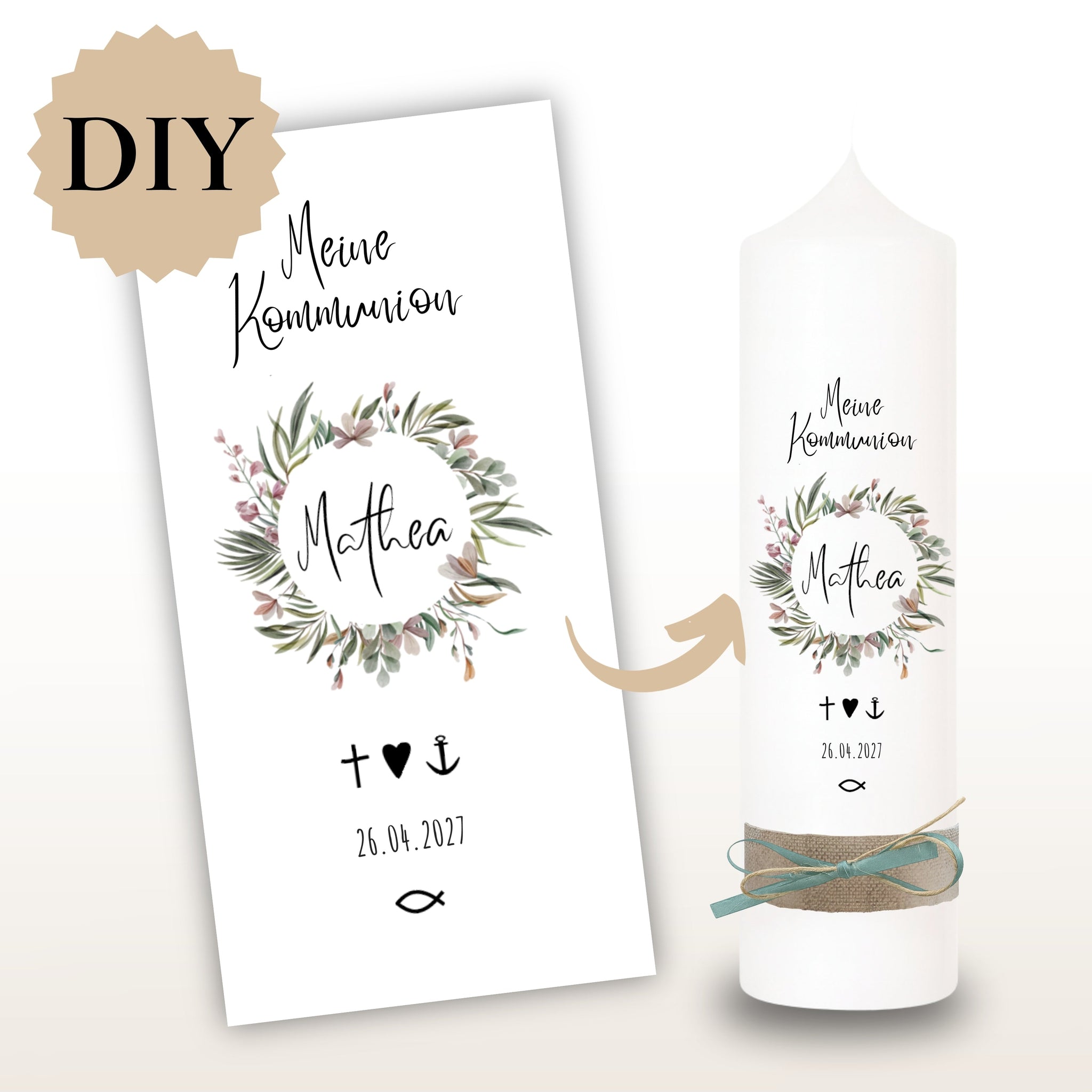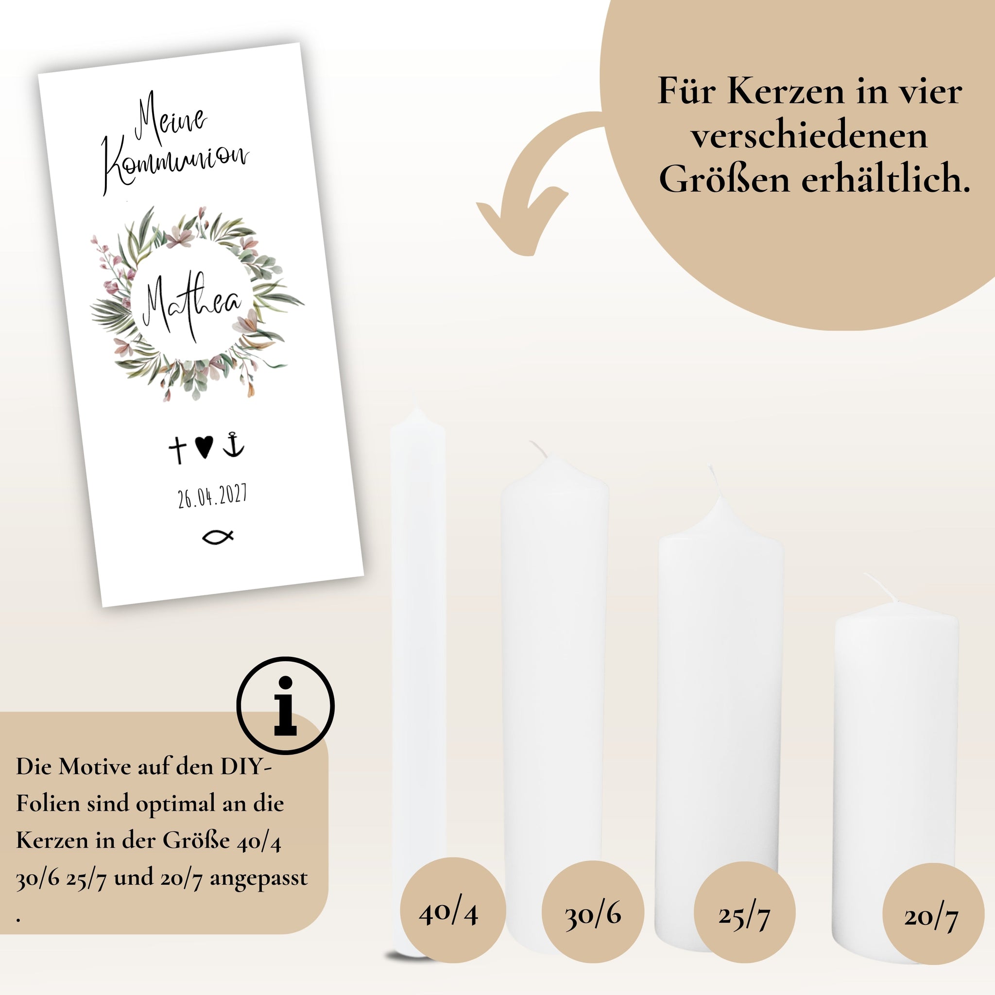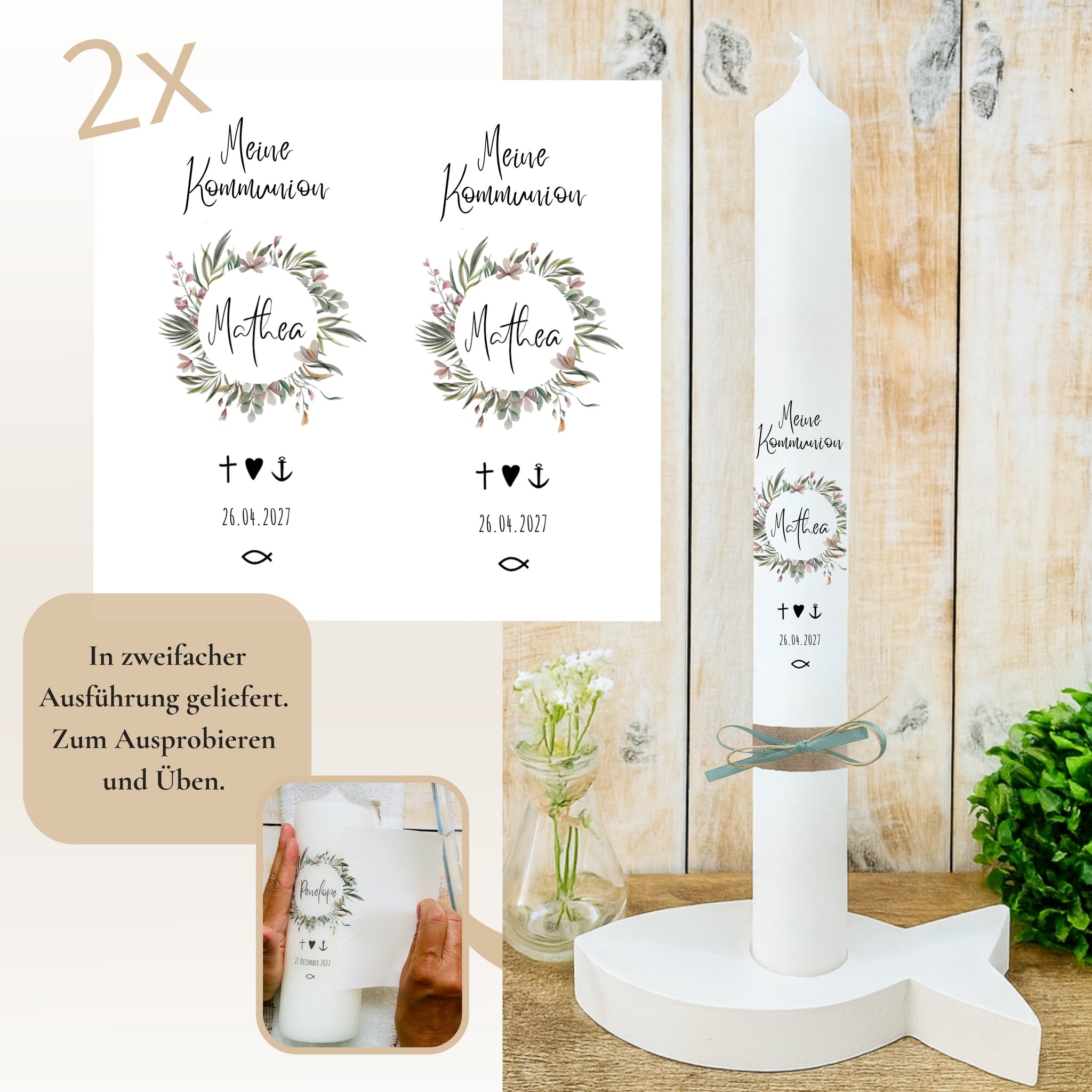 Kerzenfolie Kommunionkerze "Penelope" Blumenkranz - personalisiert