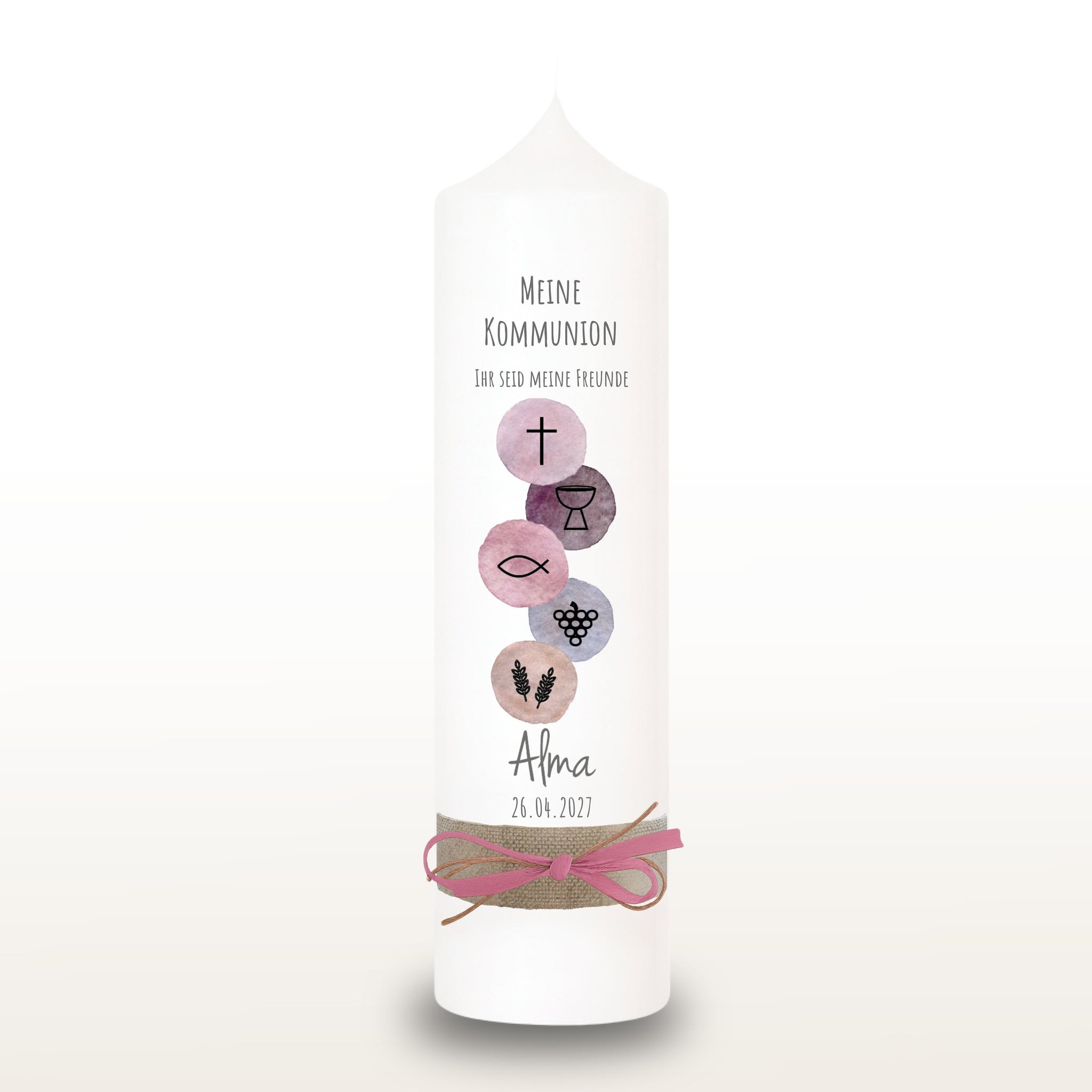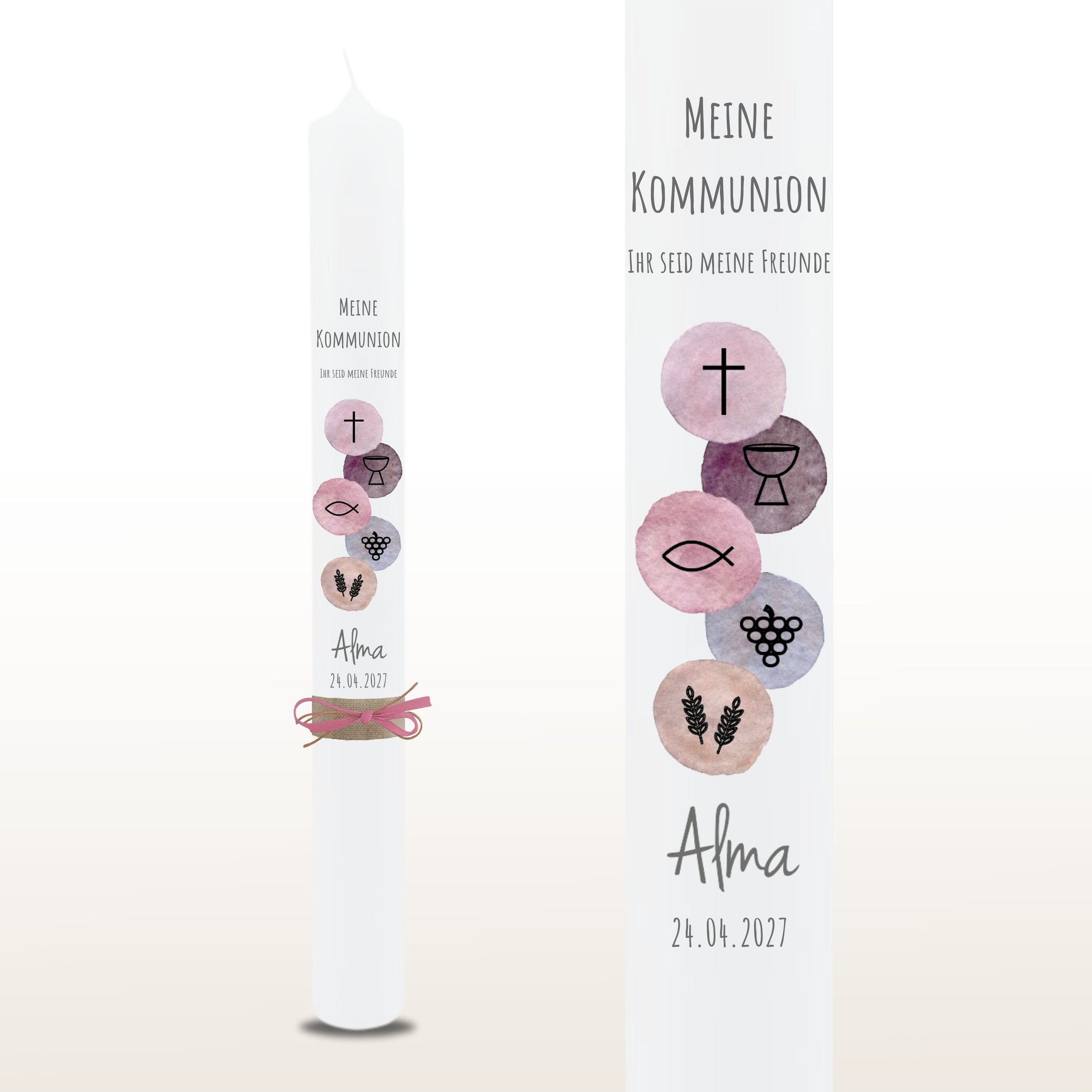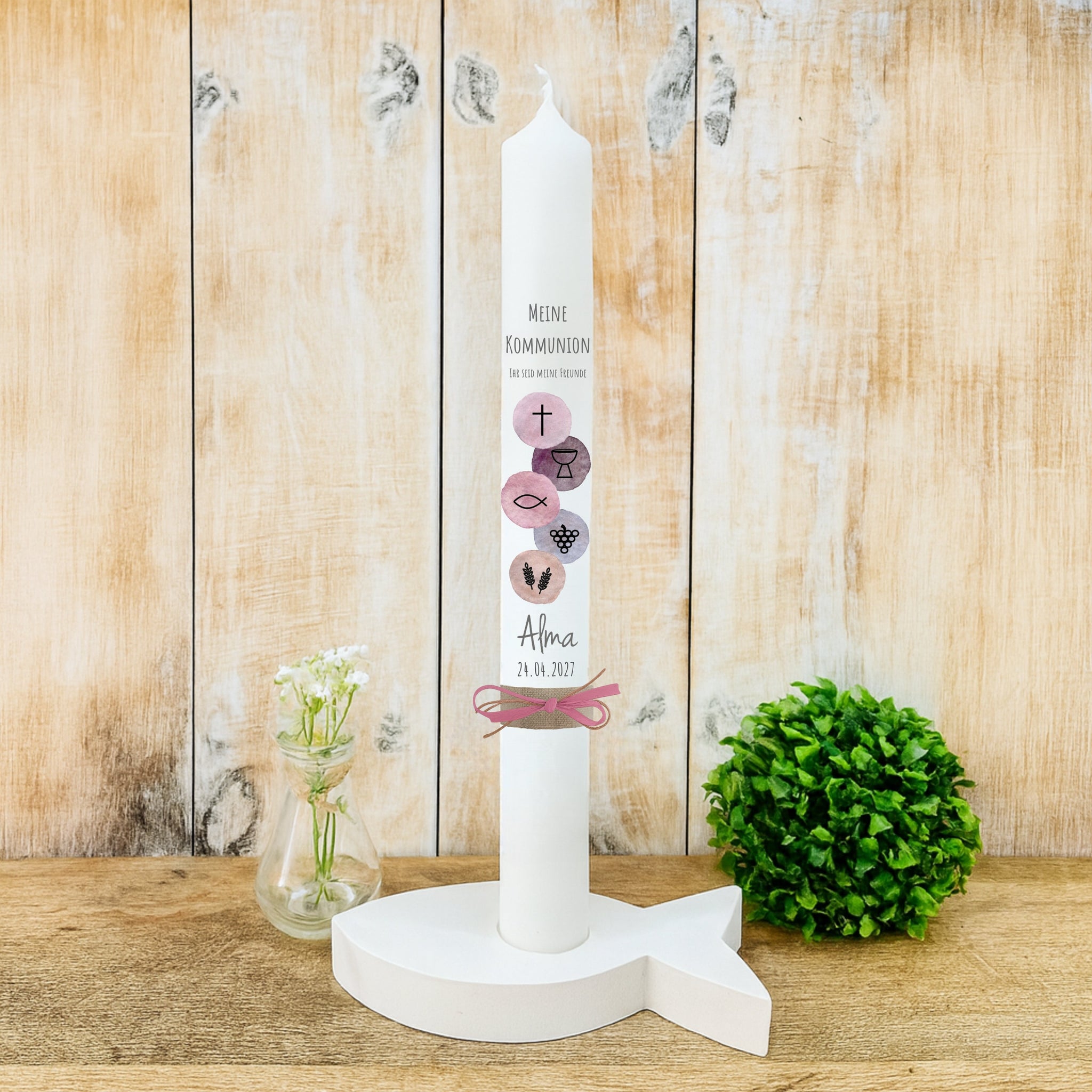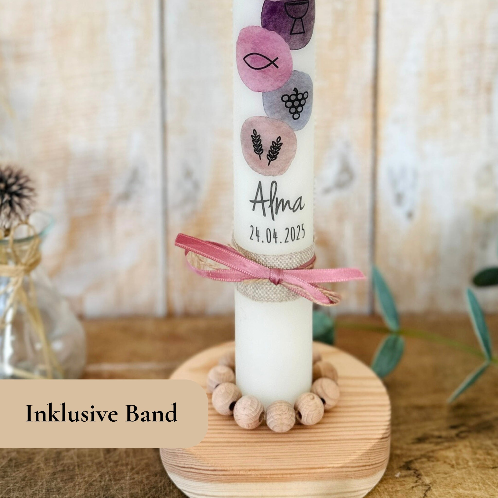 Individuelle und personalisierte Kommunionkerzen und Konfirmationskerzen für Jungen und Mädchen mit ausgefallenen Motiven, sowie passendem Zubehör - minimalistisch und modern.