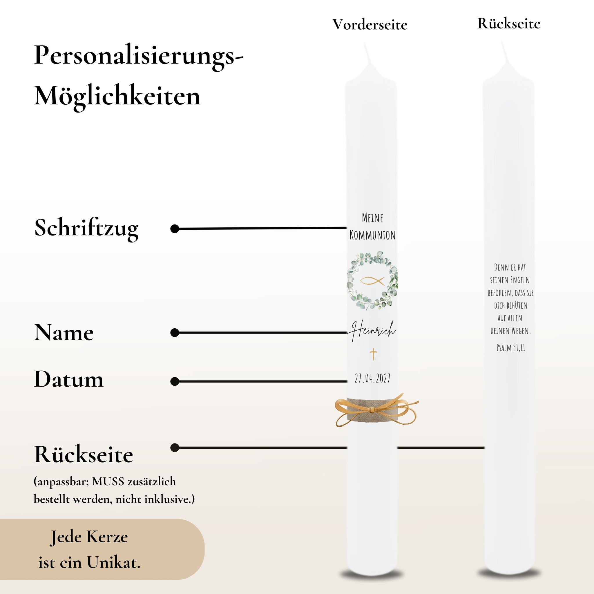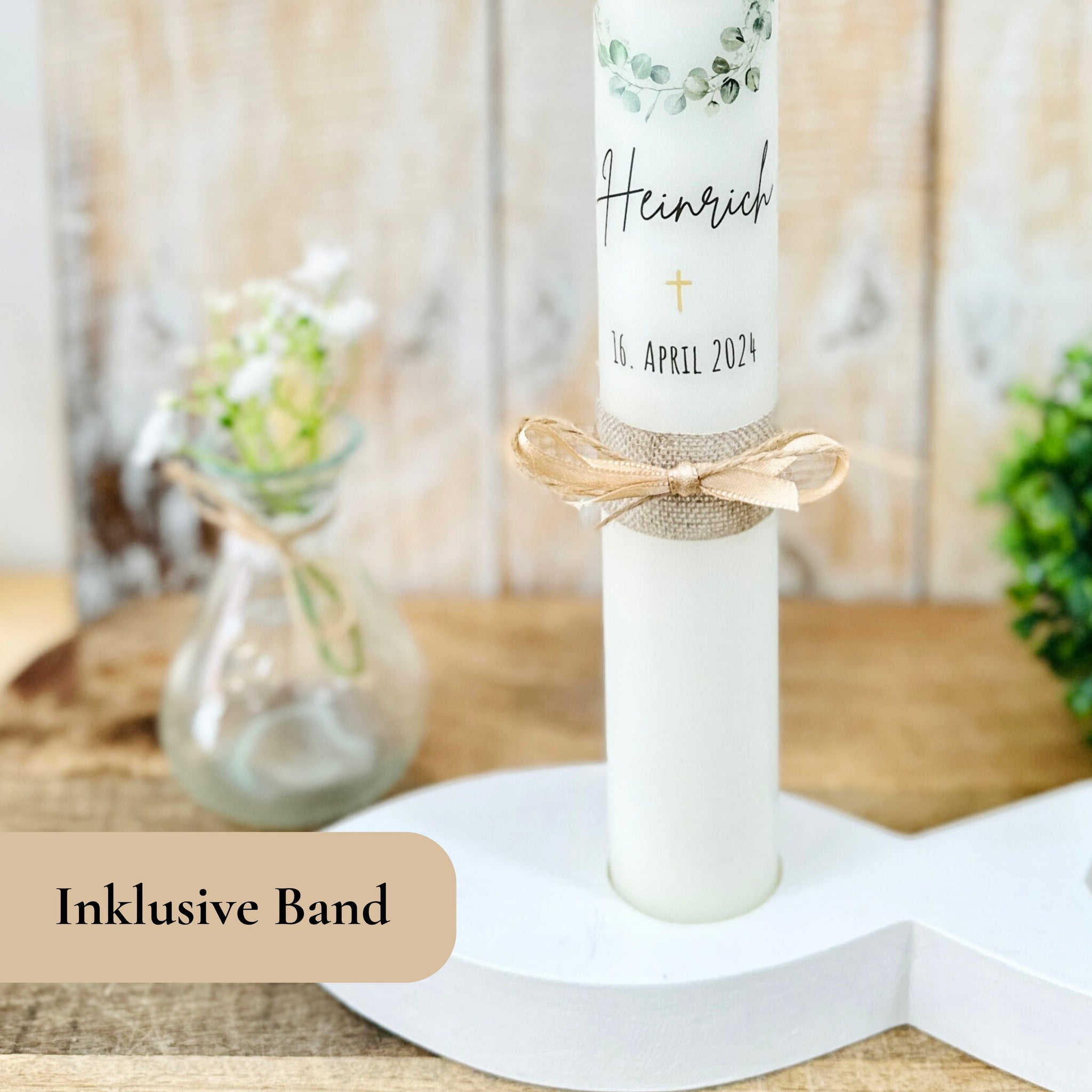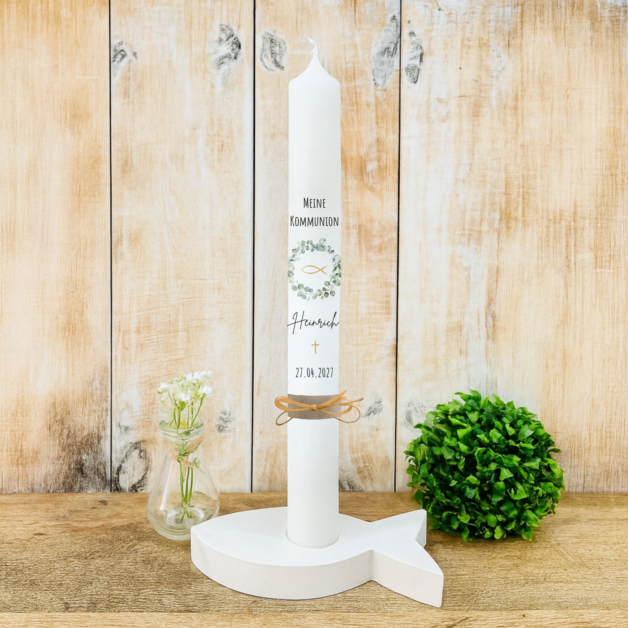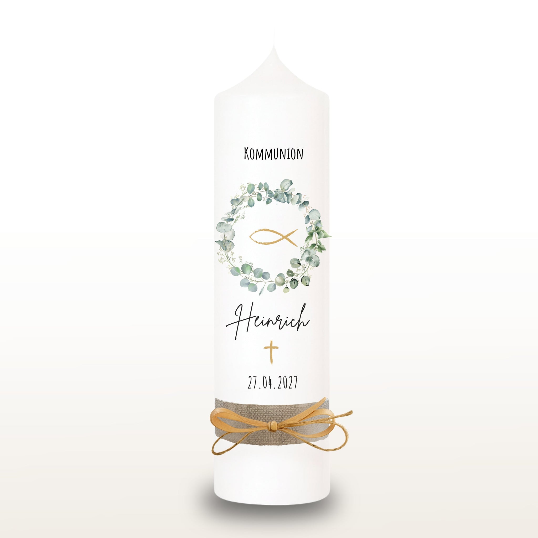 Kommunionkerze "Heinrich" Eukalyptuskranz - personalisiert