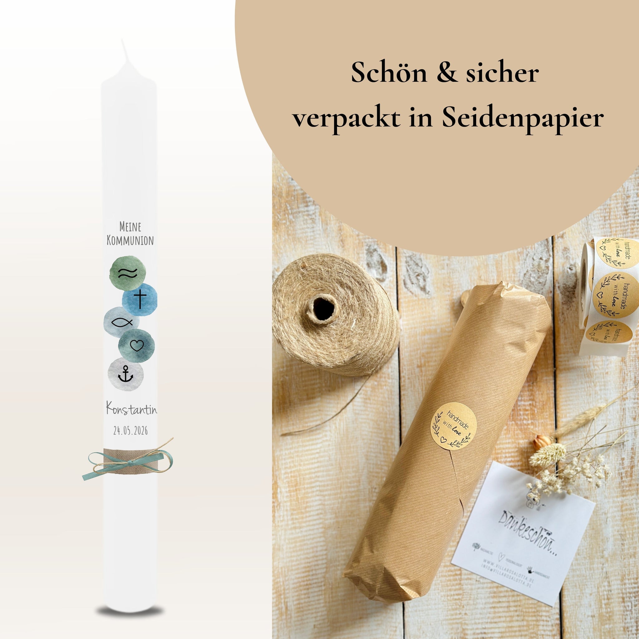 Individuelle und personalisierte Kommunionkerzen und Konfirmationskerzen für Jungen und Mädchen mit ausgefallenen Motiven, sowie passendem Zubehör - minimalistisch und modern.