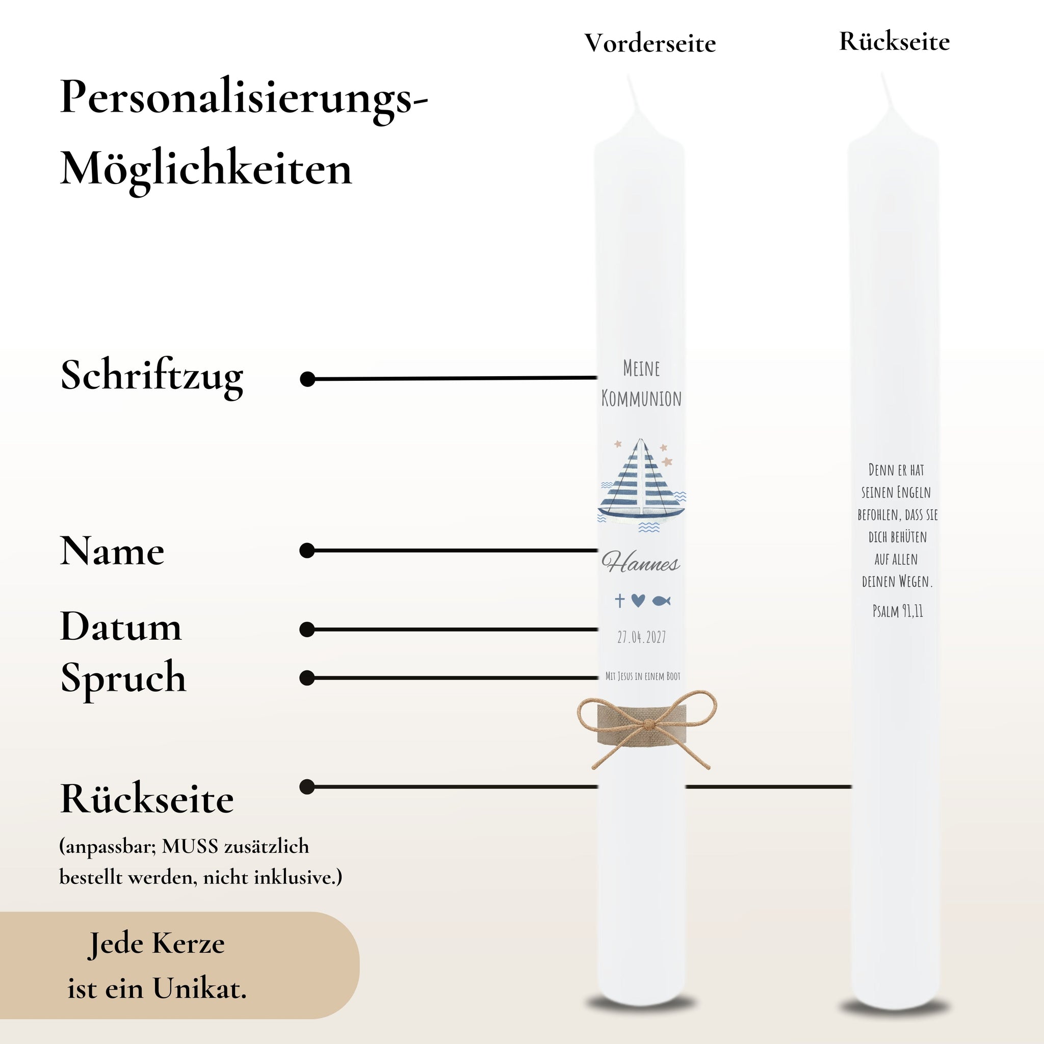 Individuelle und personalisierte Kommunionkerzen und Konfirmationskerzen für Jungen und Mädchen mit ausgefallenen Motiven, sowie passendem Zubehör - minimalistisch und modern.