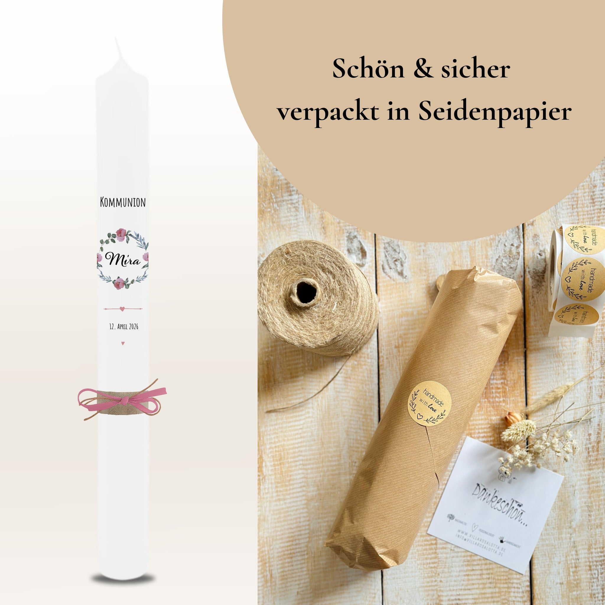 Individuelle und personalisierte Kommunionkerzen und Konfirmationskerzen für Jungen und Mädchen mit ausgefallenen Motiven, sowie passendem Zubehör - minimalistisch und modern.