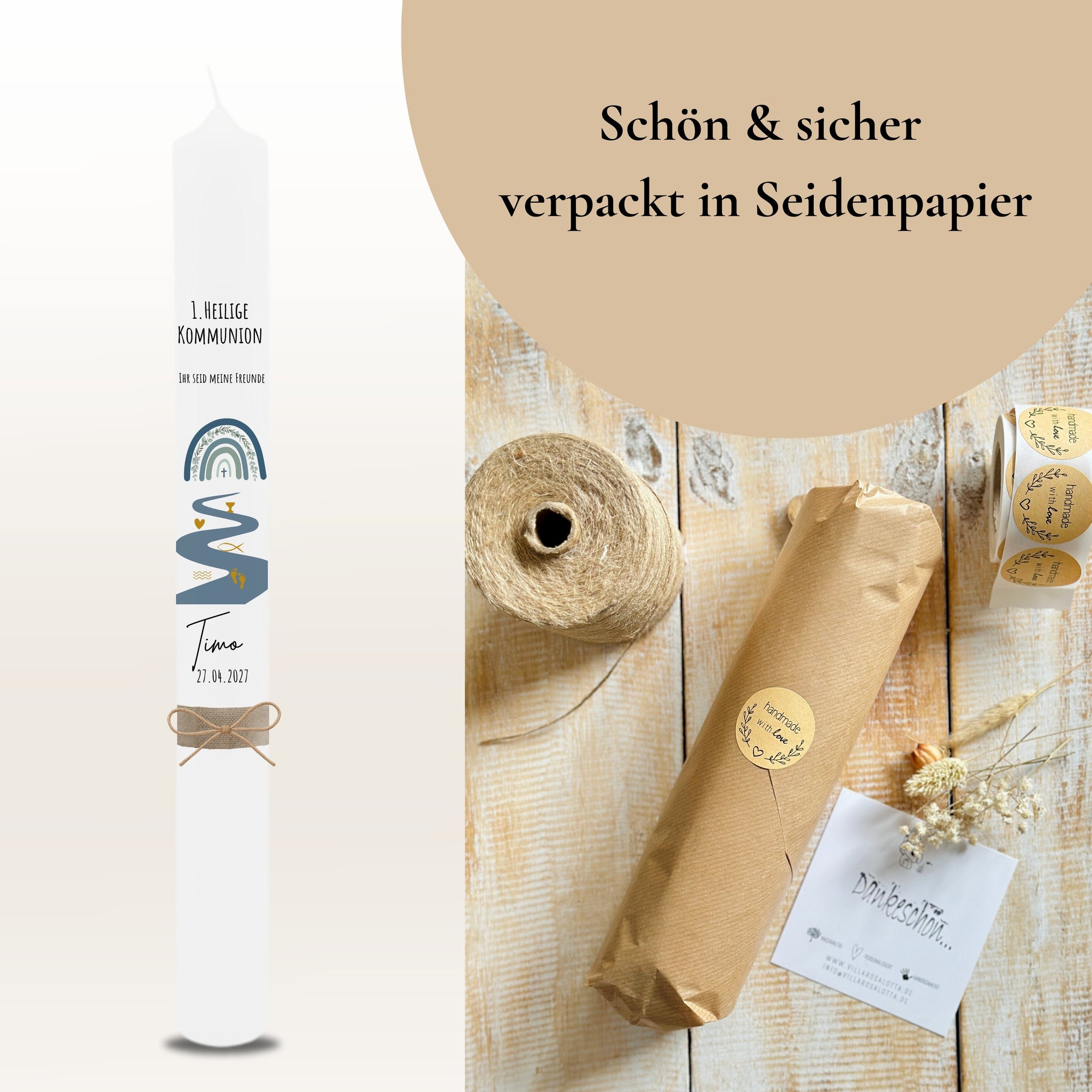 Individuelle und personalisierte Kommunionkerzen und Konfirmationskerzen für Jungen und Mädchen mit ausgefallenen Motiven, sowie passendem Zubehör - minimalistisch und modern.