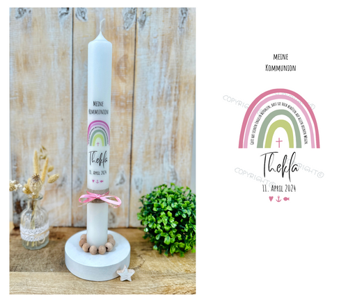 Kommunionkerze "Thekla" Regenbogen |Spruch | Kreuz | rosa - personalisiert