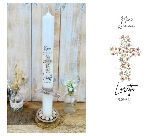 Kommunionkerze "Loretta" Blumen | Kreuz | Blumenkreuz - personalisiert