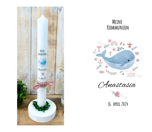 Kommunionkerze "Anastasia" Wal rosa mit christlichen Symbolen - personalisiert
