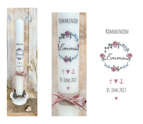 Kommunionkerze "Lola" Blumenkranz Rosen - personalisiert