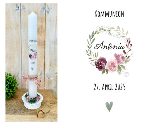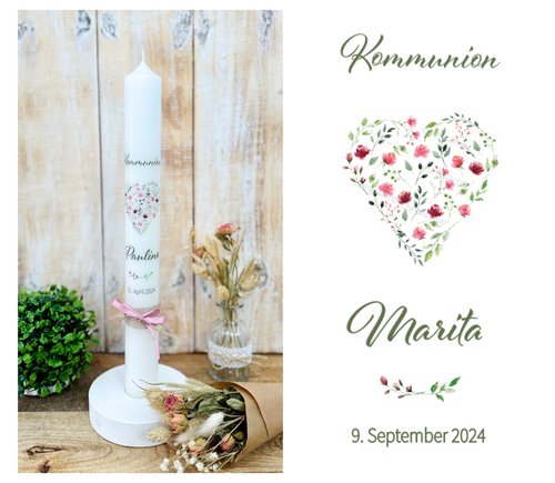 Kommunionkerze "Marita“ Blumenherz - personalisiert