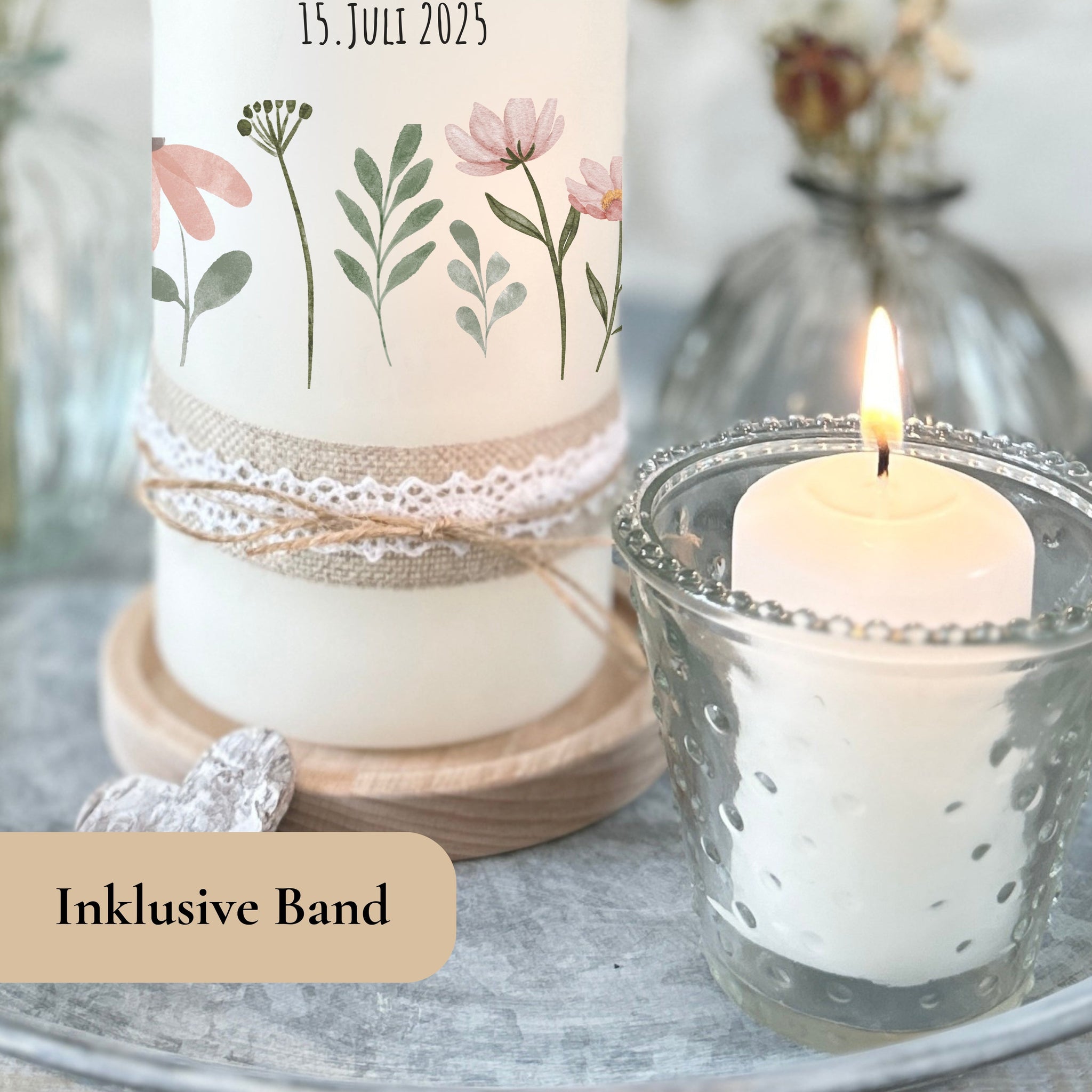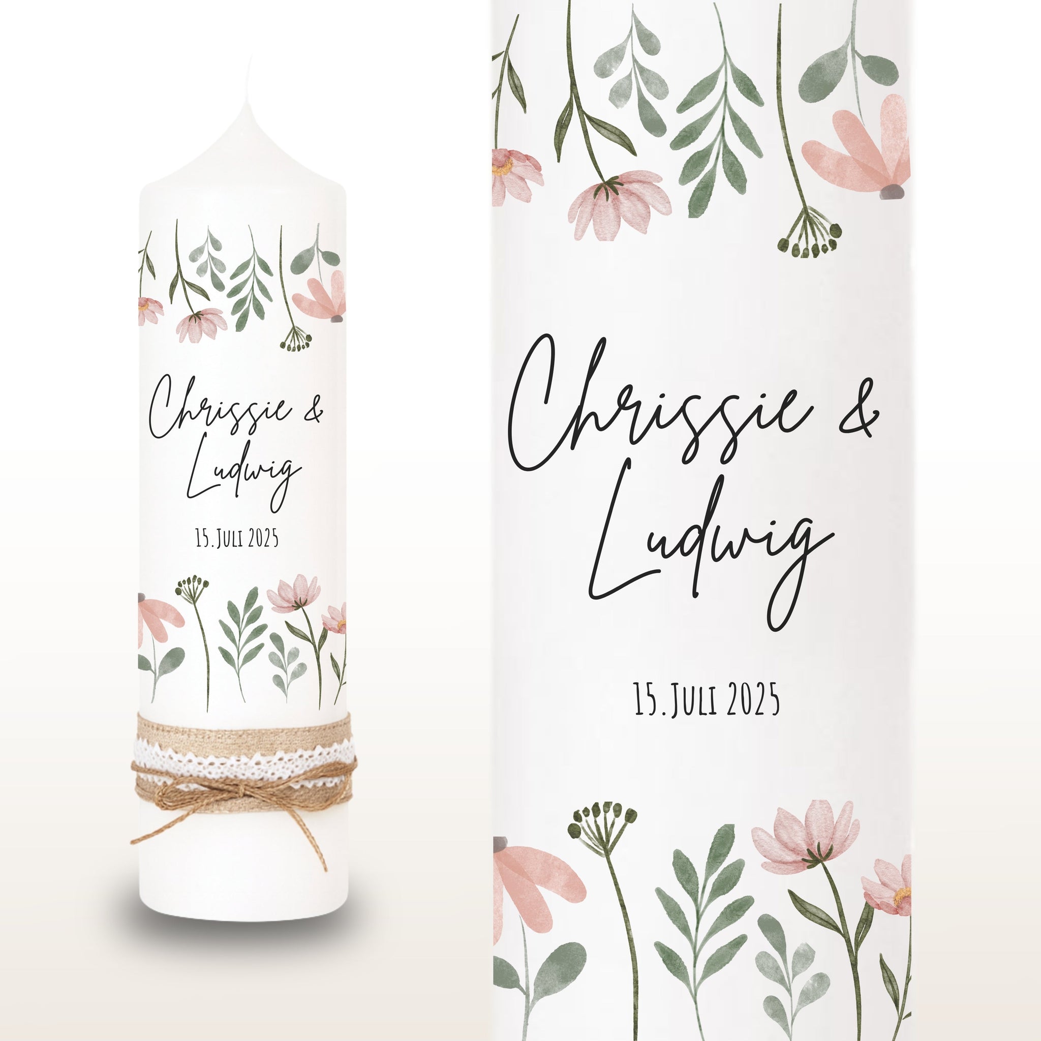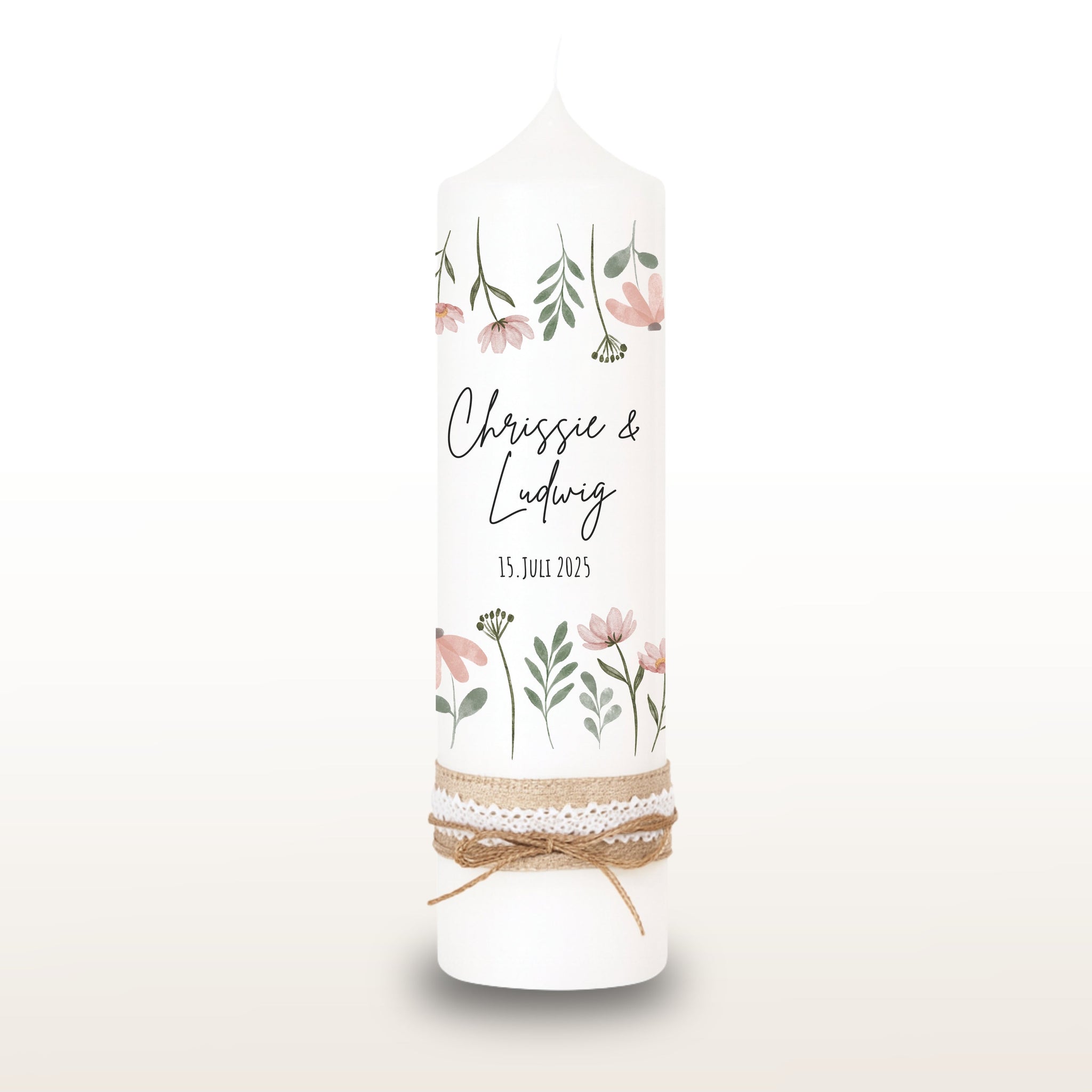 Hochzeitskerze "Chrissie" Blumenwiese rosa - personalisiert