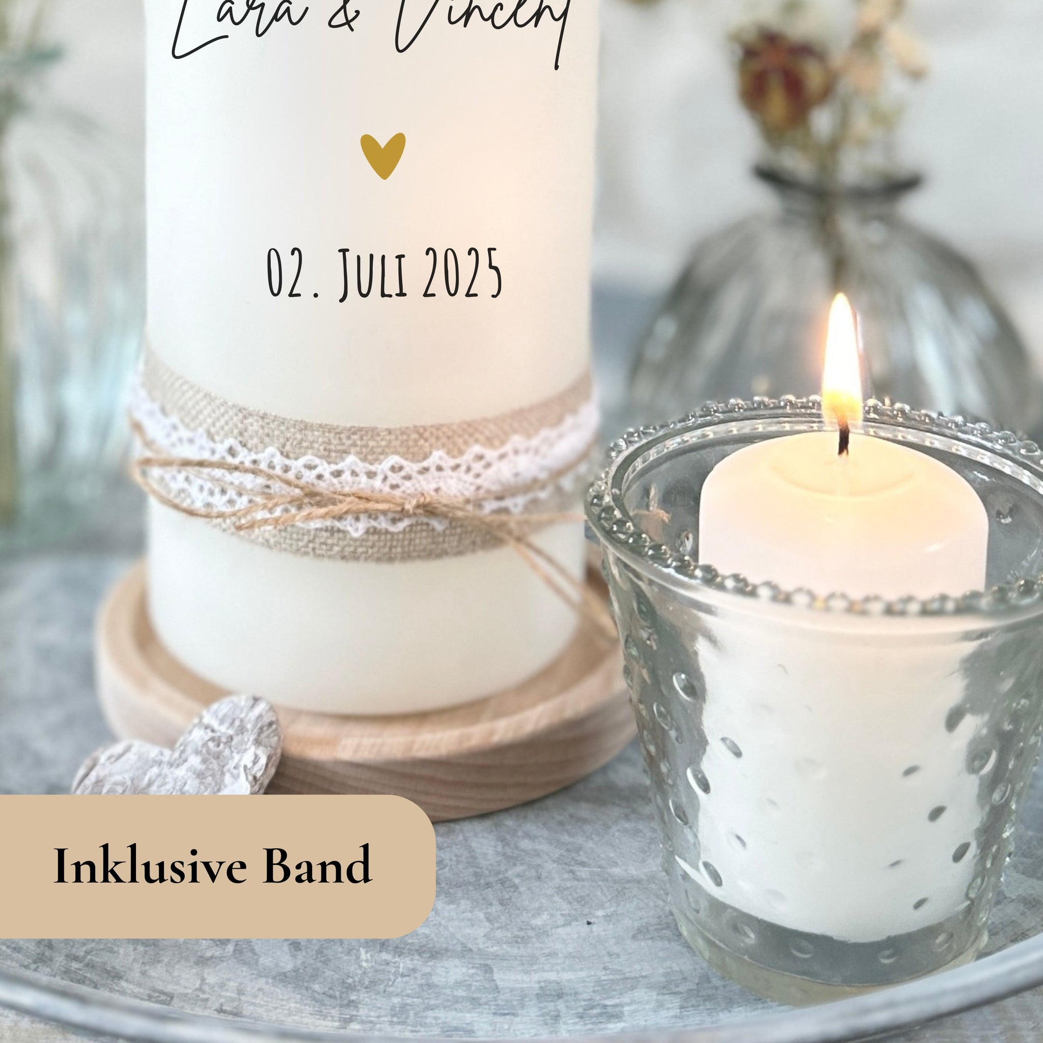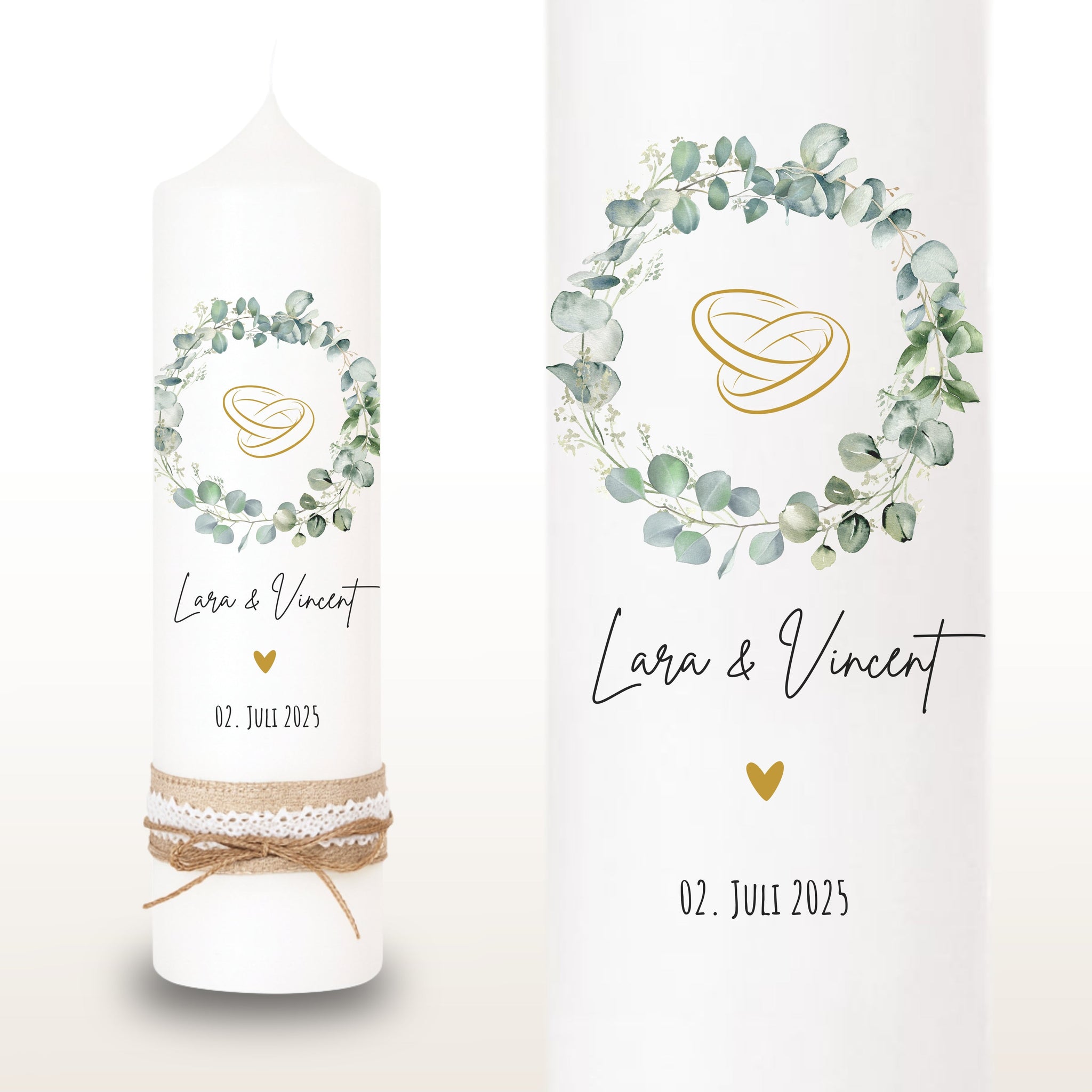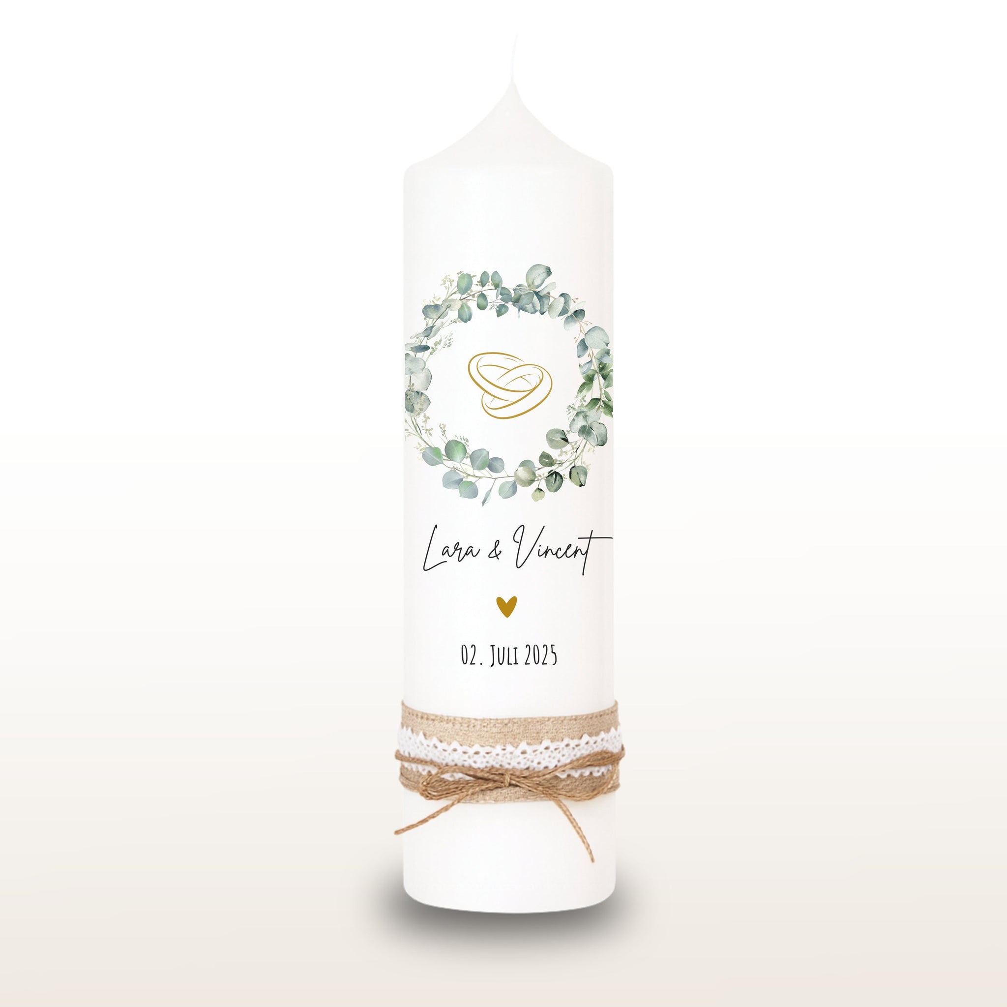 Hochzeitskerze "Lara" Eukalyptuskranz Ringe - personalisiert