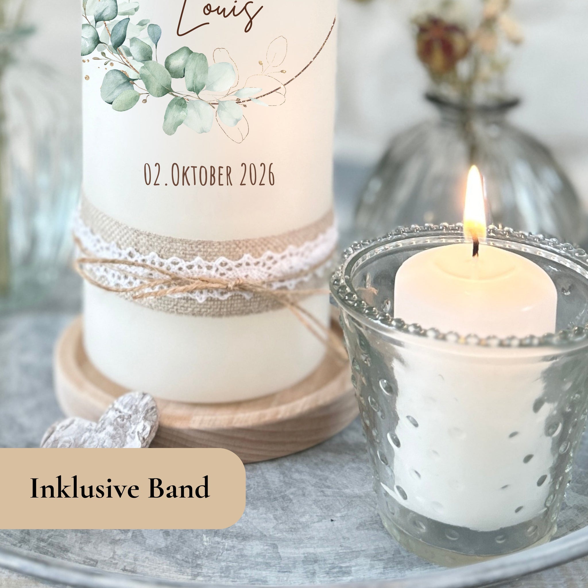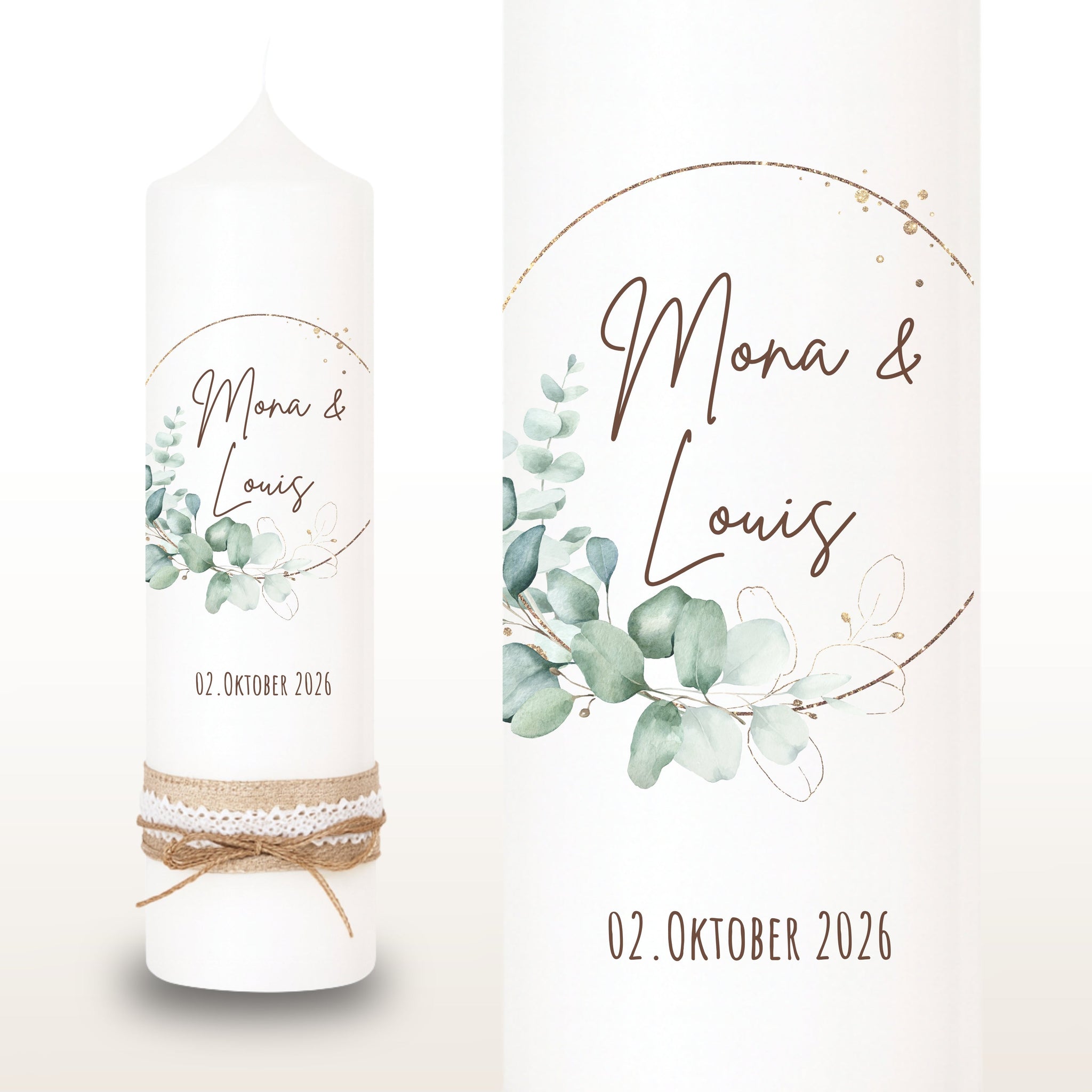 Hochzeitskerze "Mona" Kranz Eukalyptus gold - personalisiert