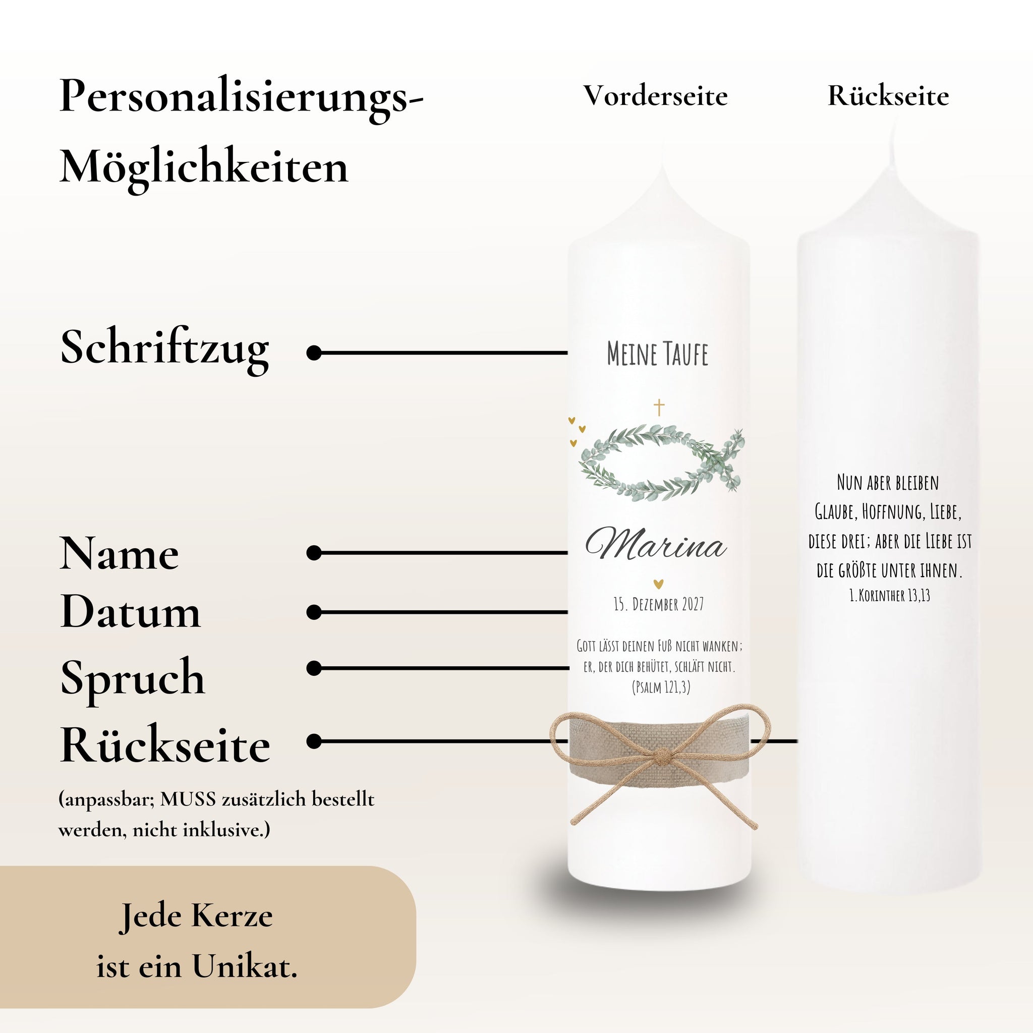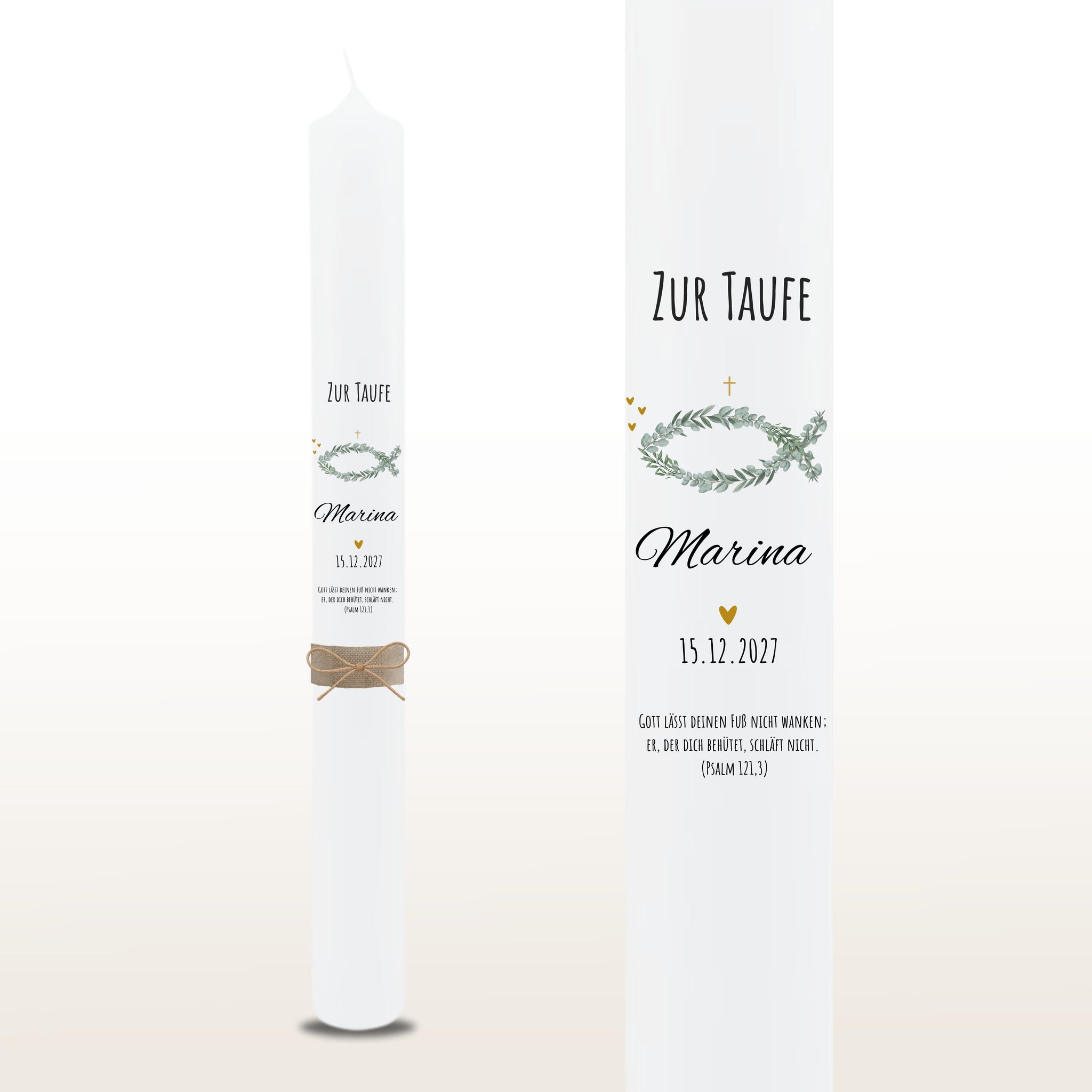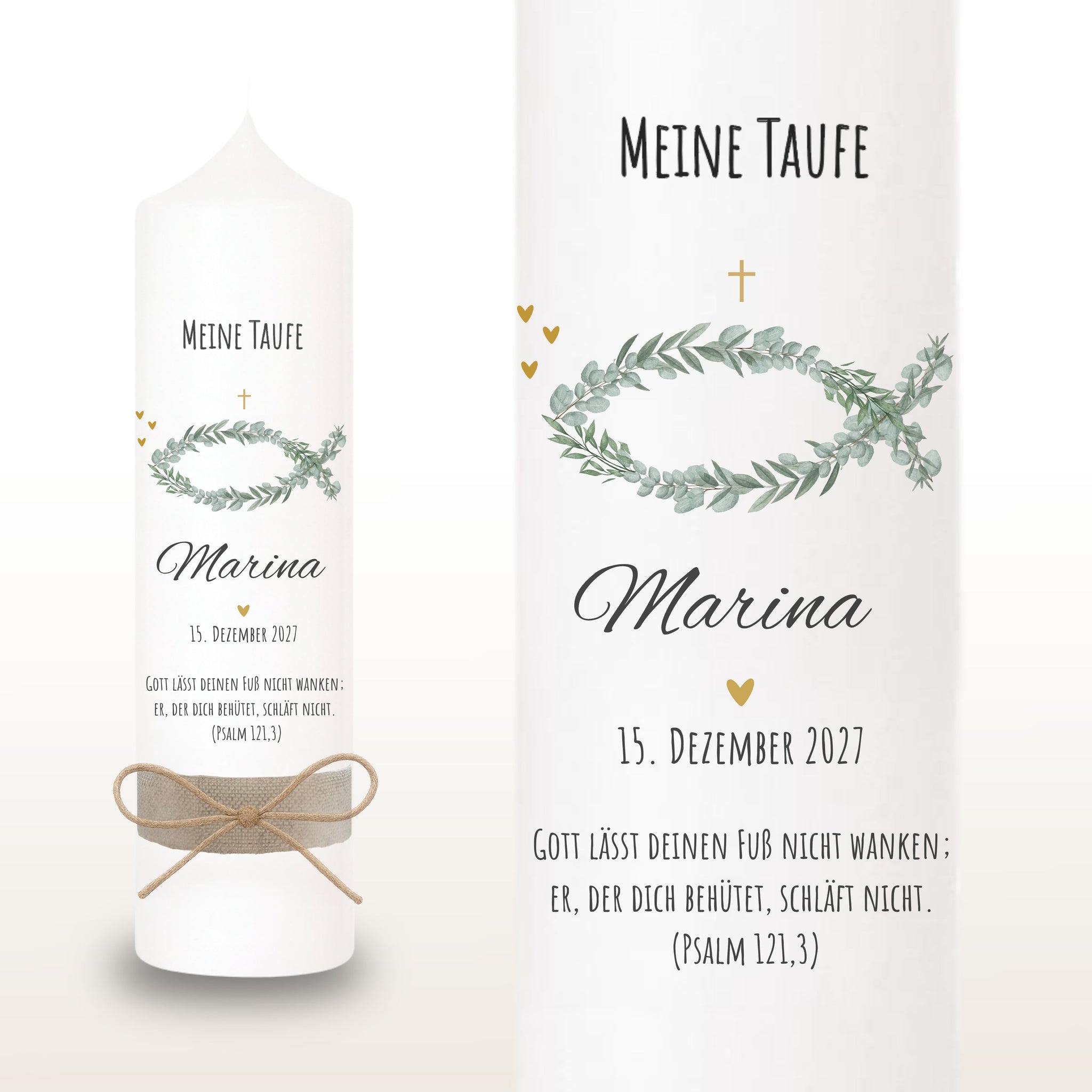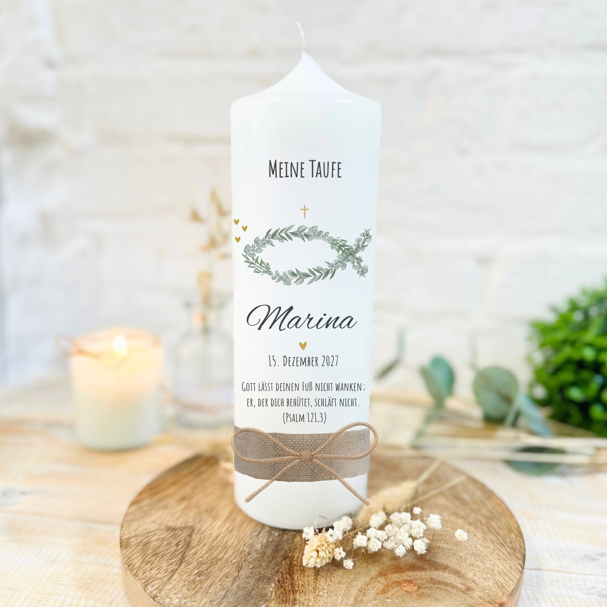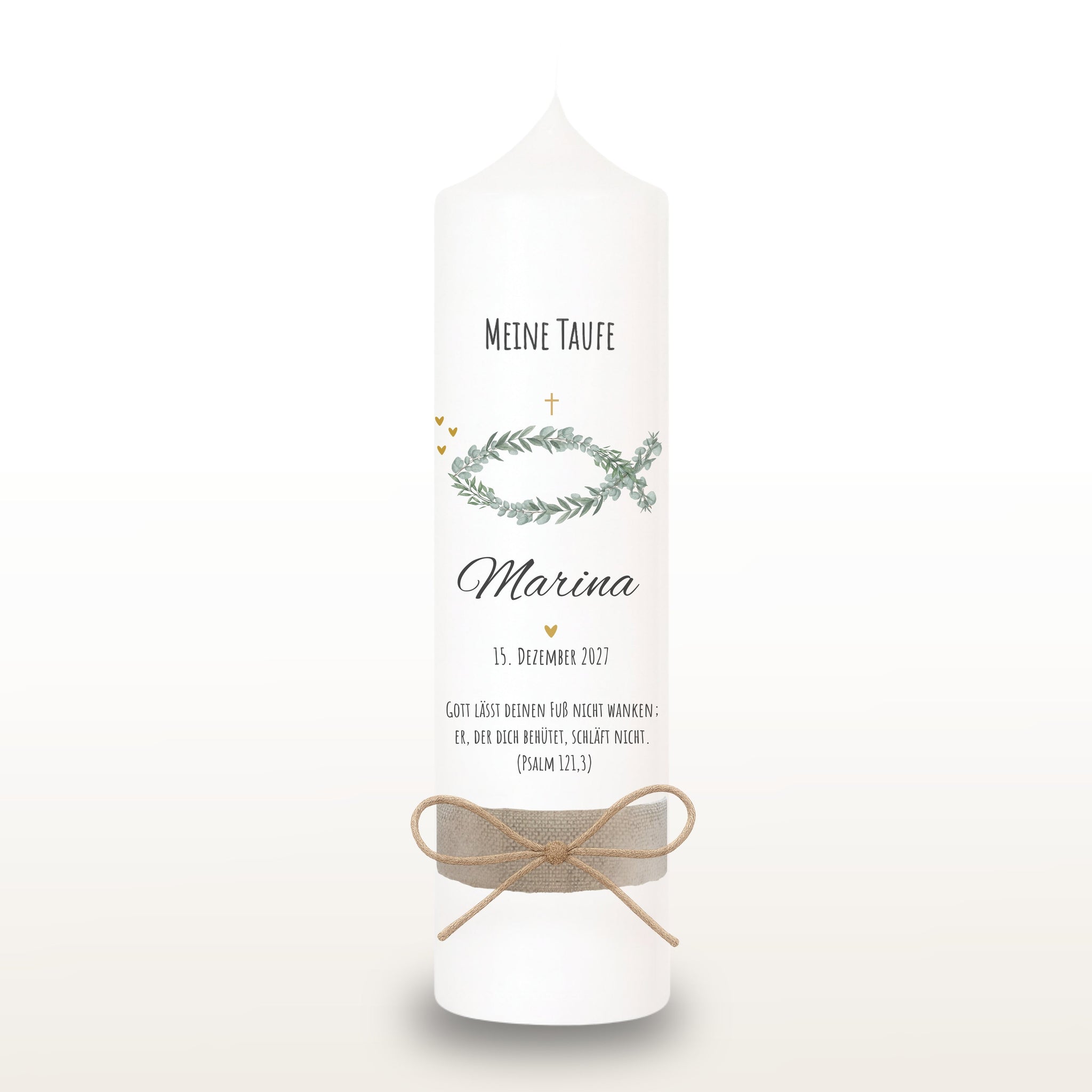 Taufkerze "Marina" Eukalyptusfisch Spruch - personalisiert