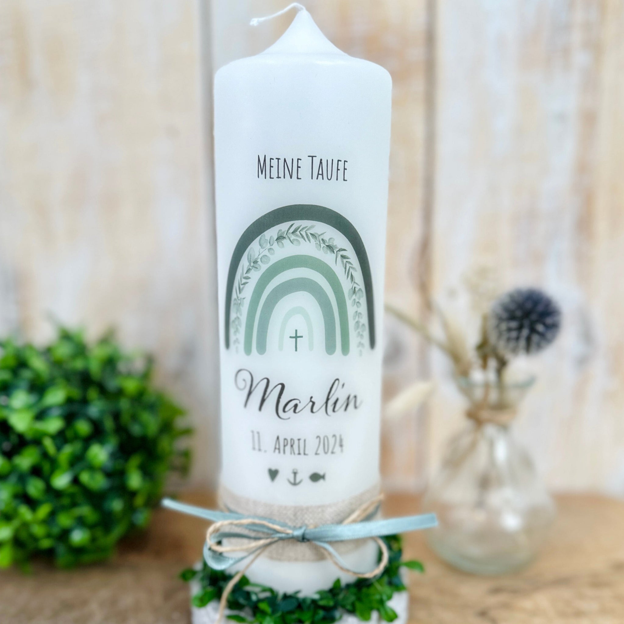 Taufkerze "Marlin" Eukalyptus Regenbogen - personalisiert