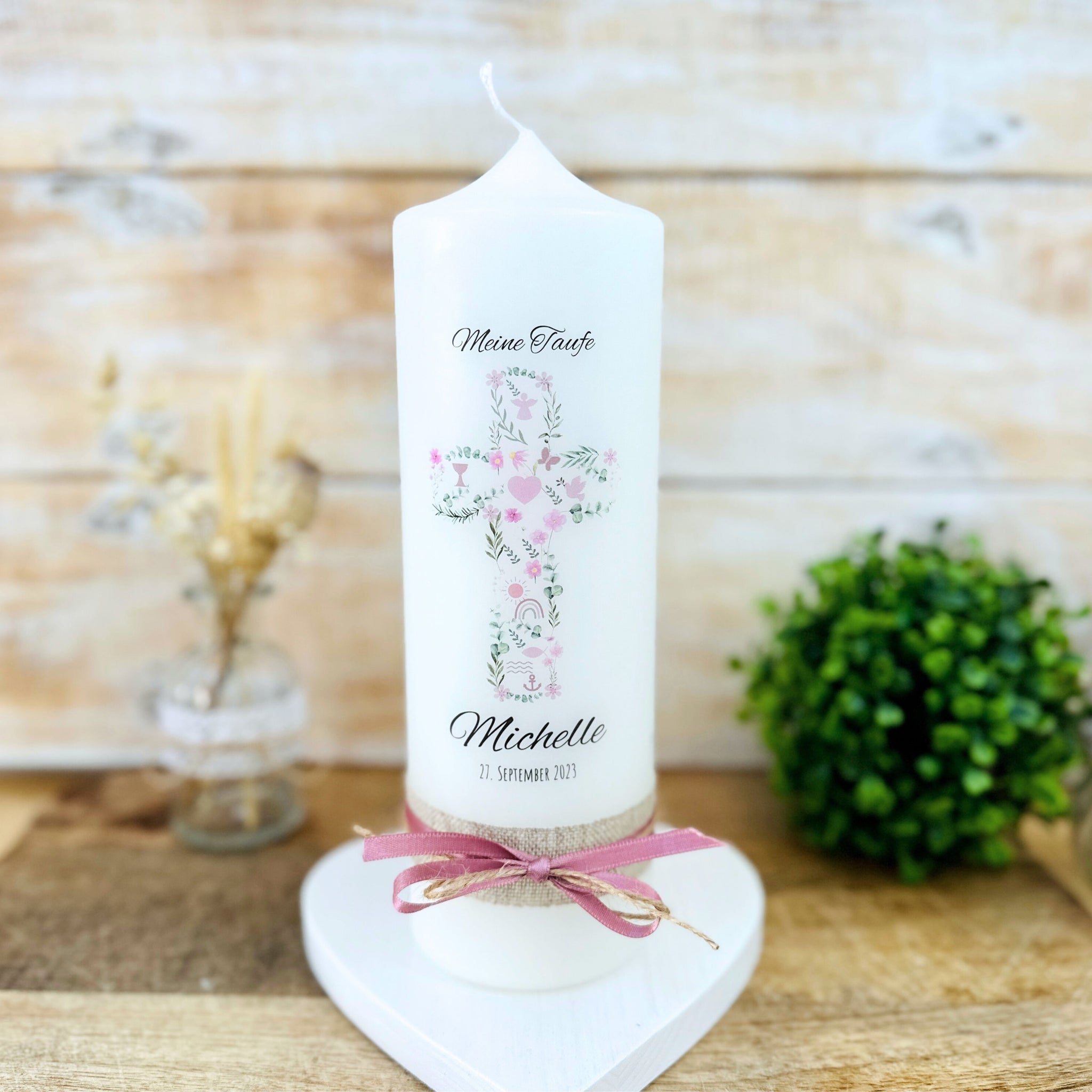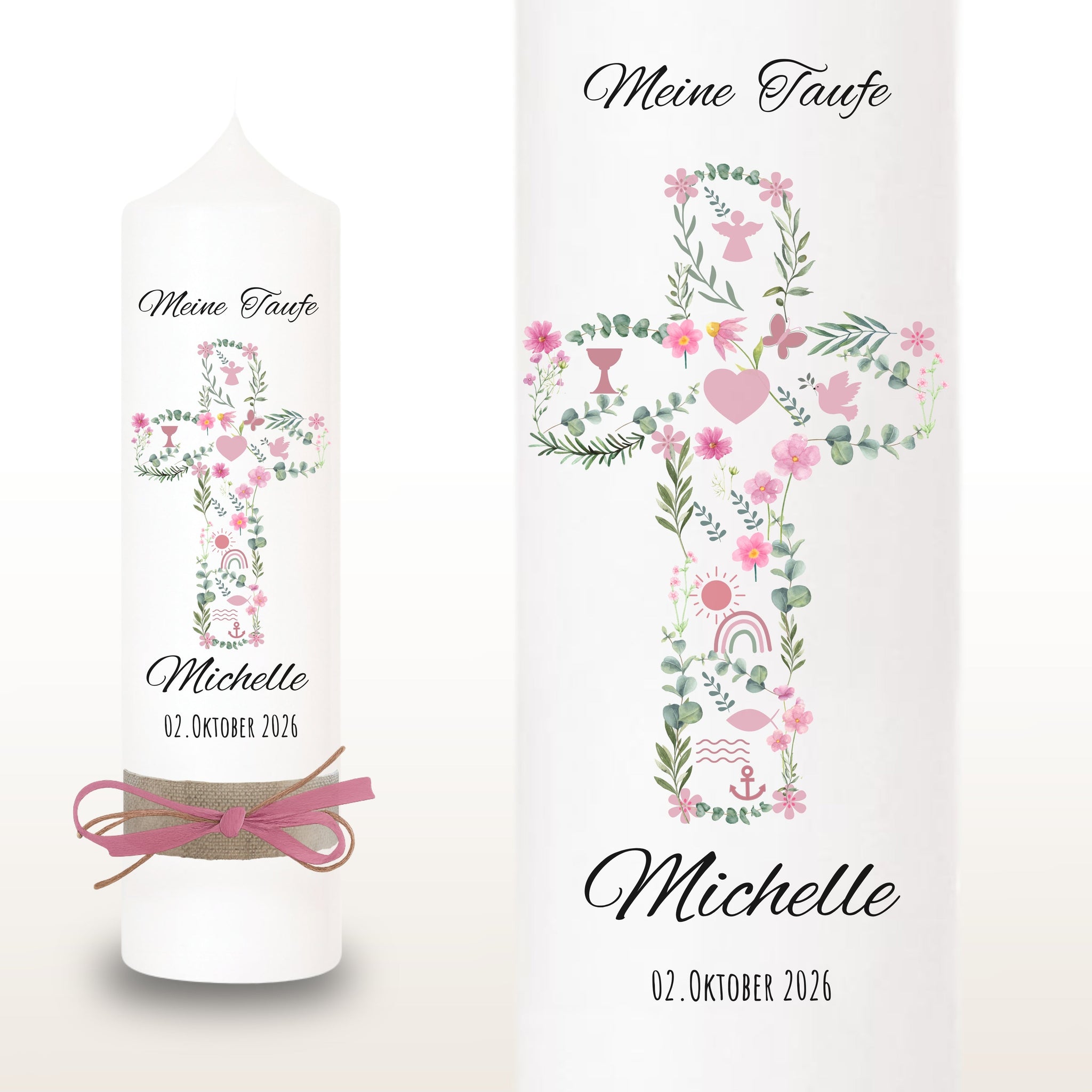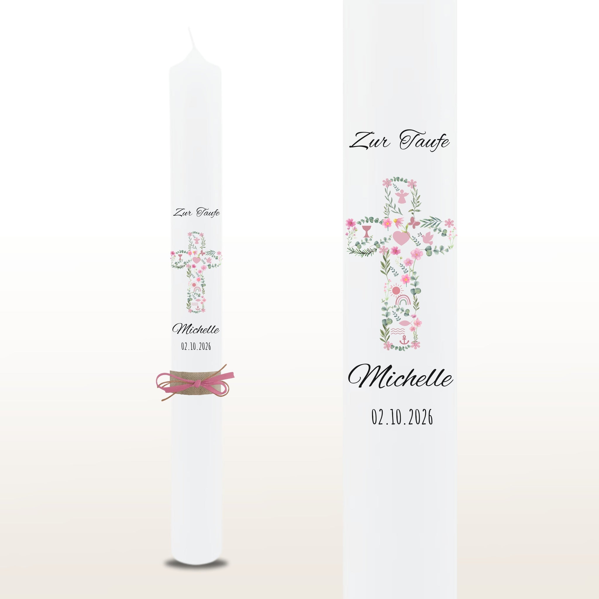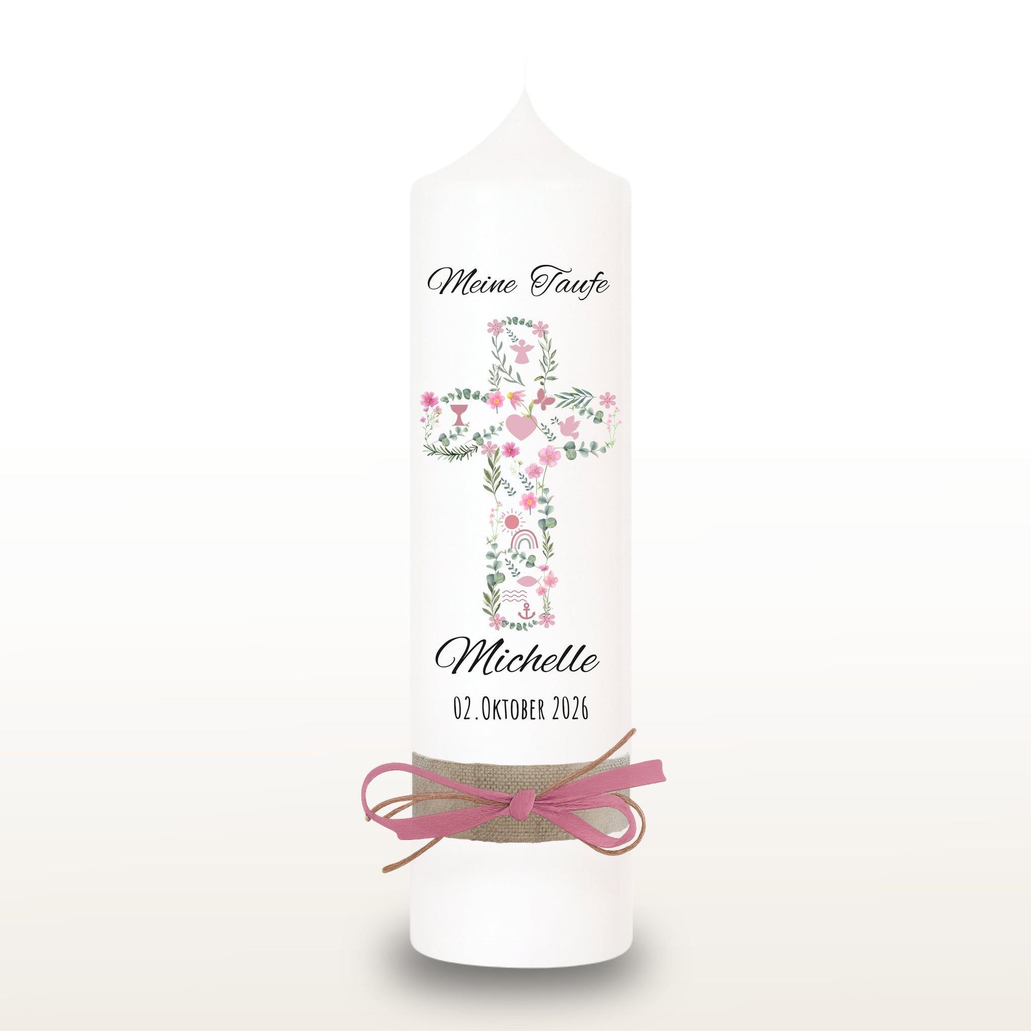 Taufkerze "Michelle" Kreuz | christliche Symbole | Rosa - personalisiert