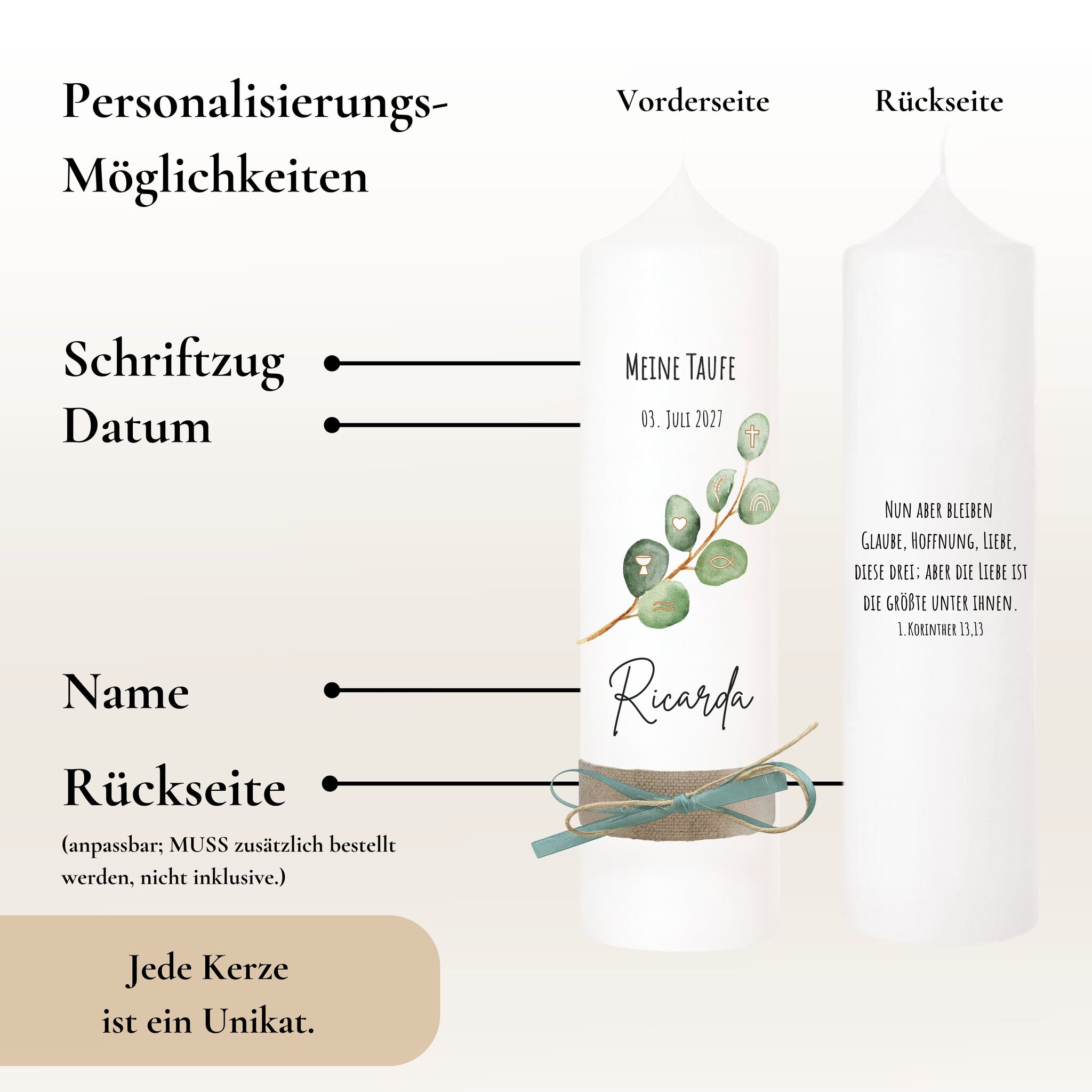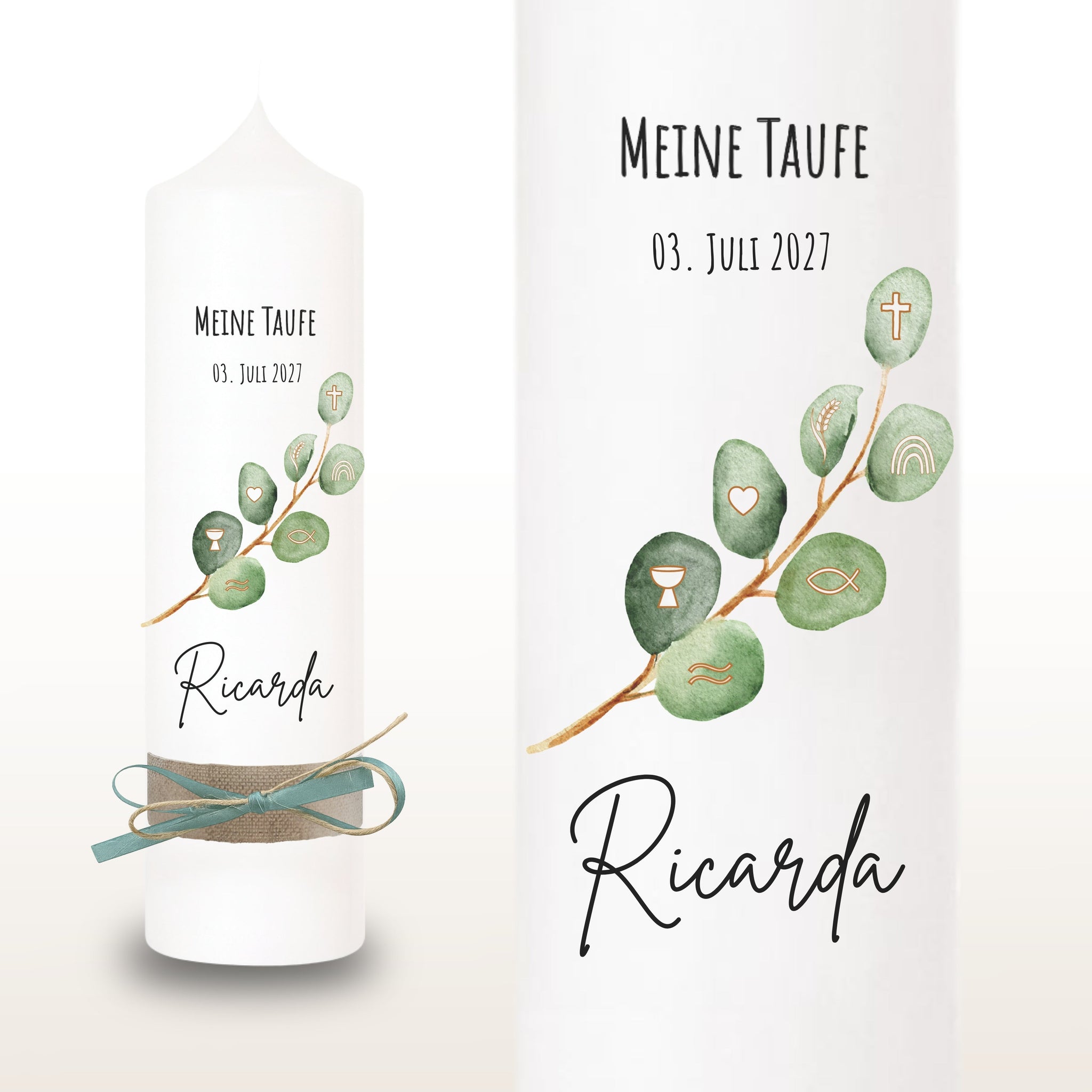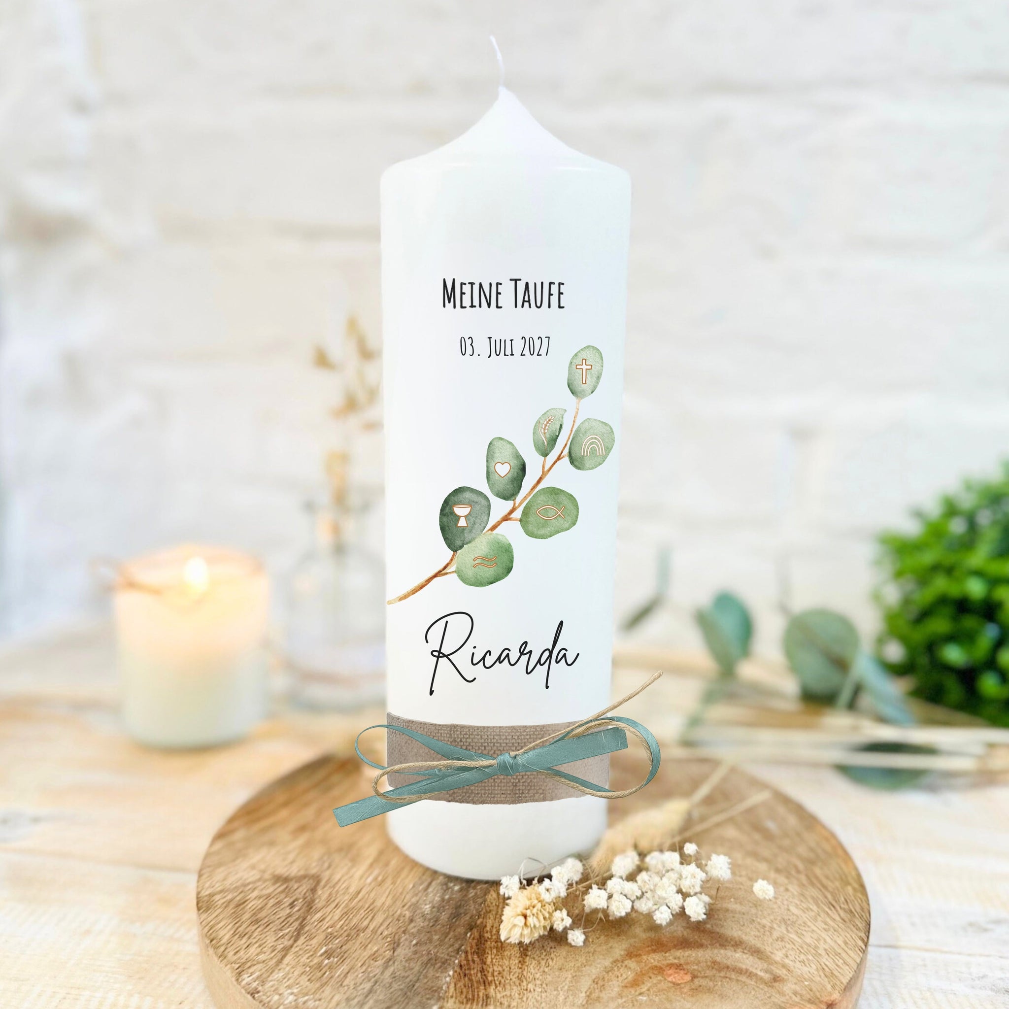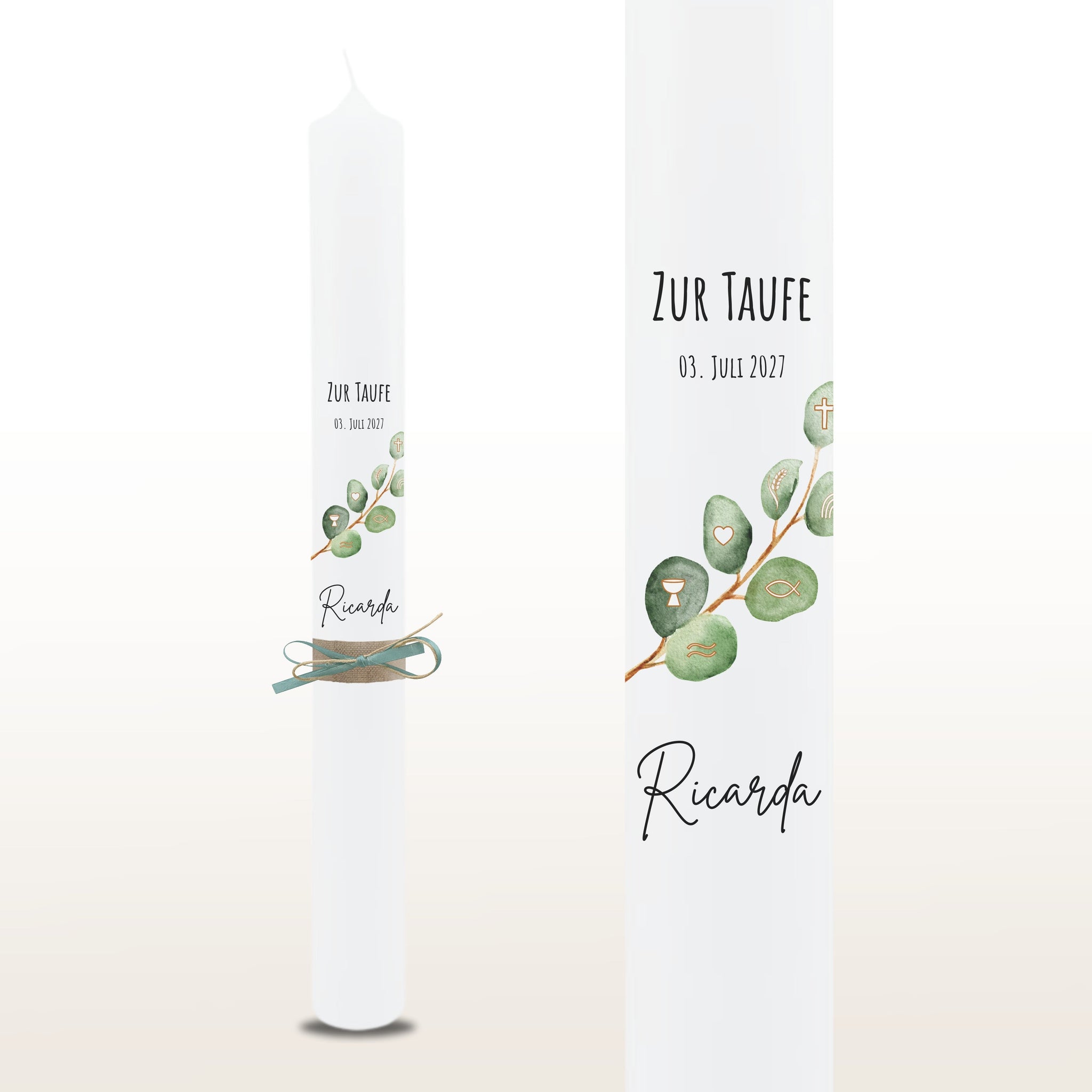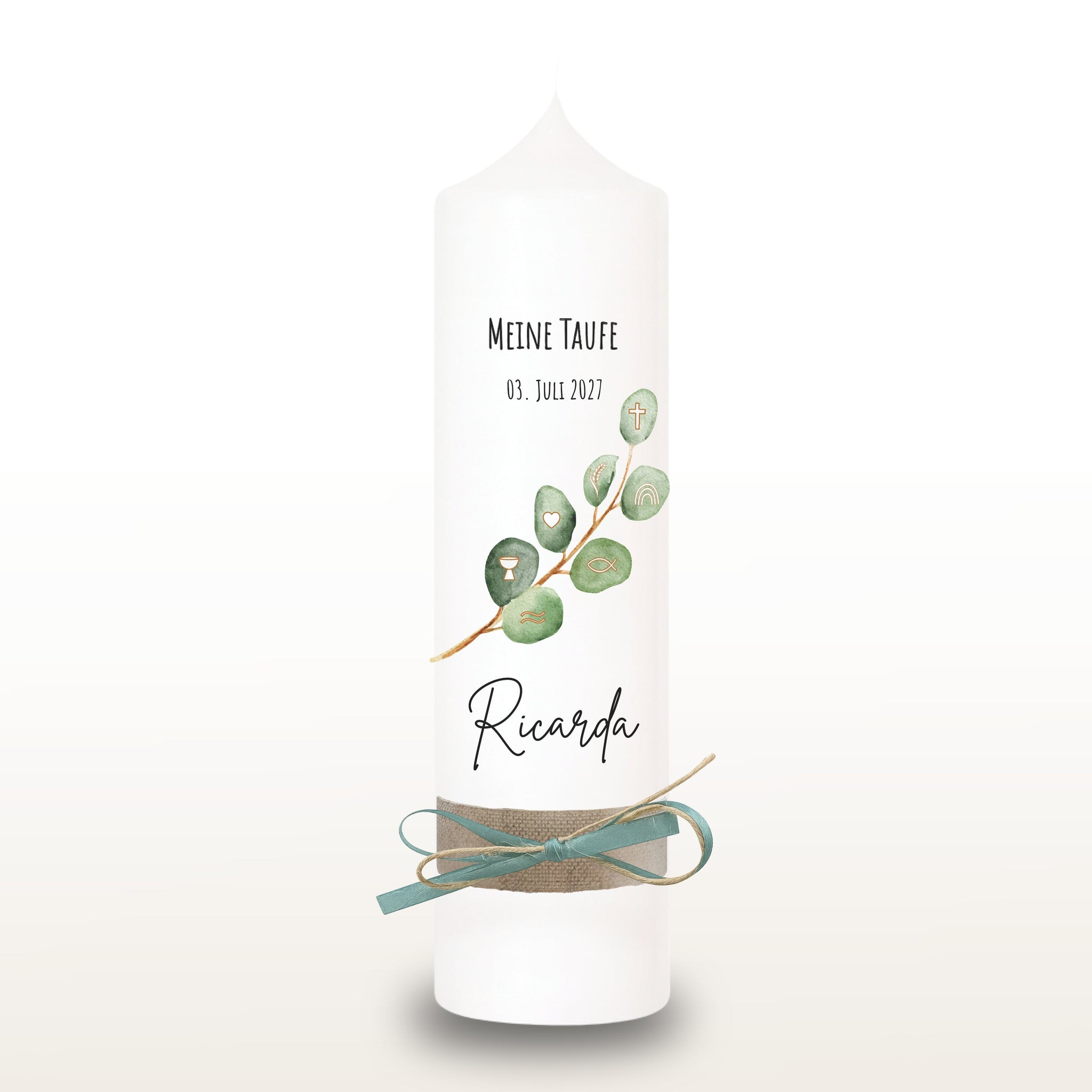 Taufkerze "Ricarda" Eukalyptusfisch Spruch - personalisiert