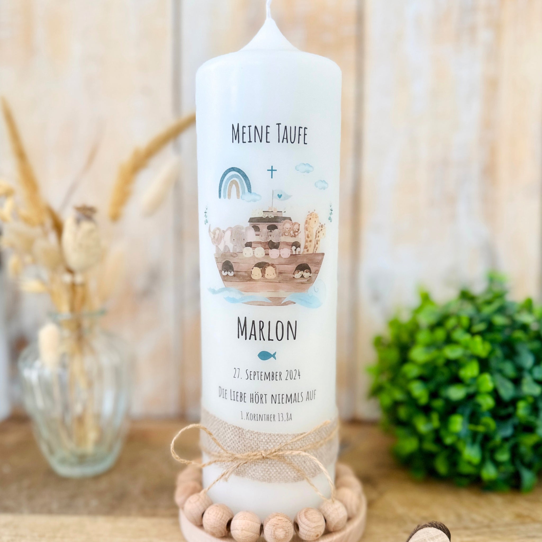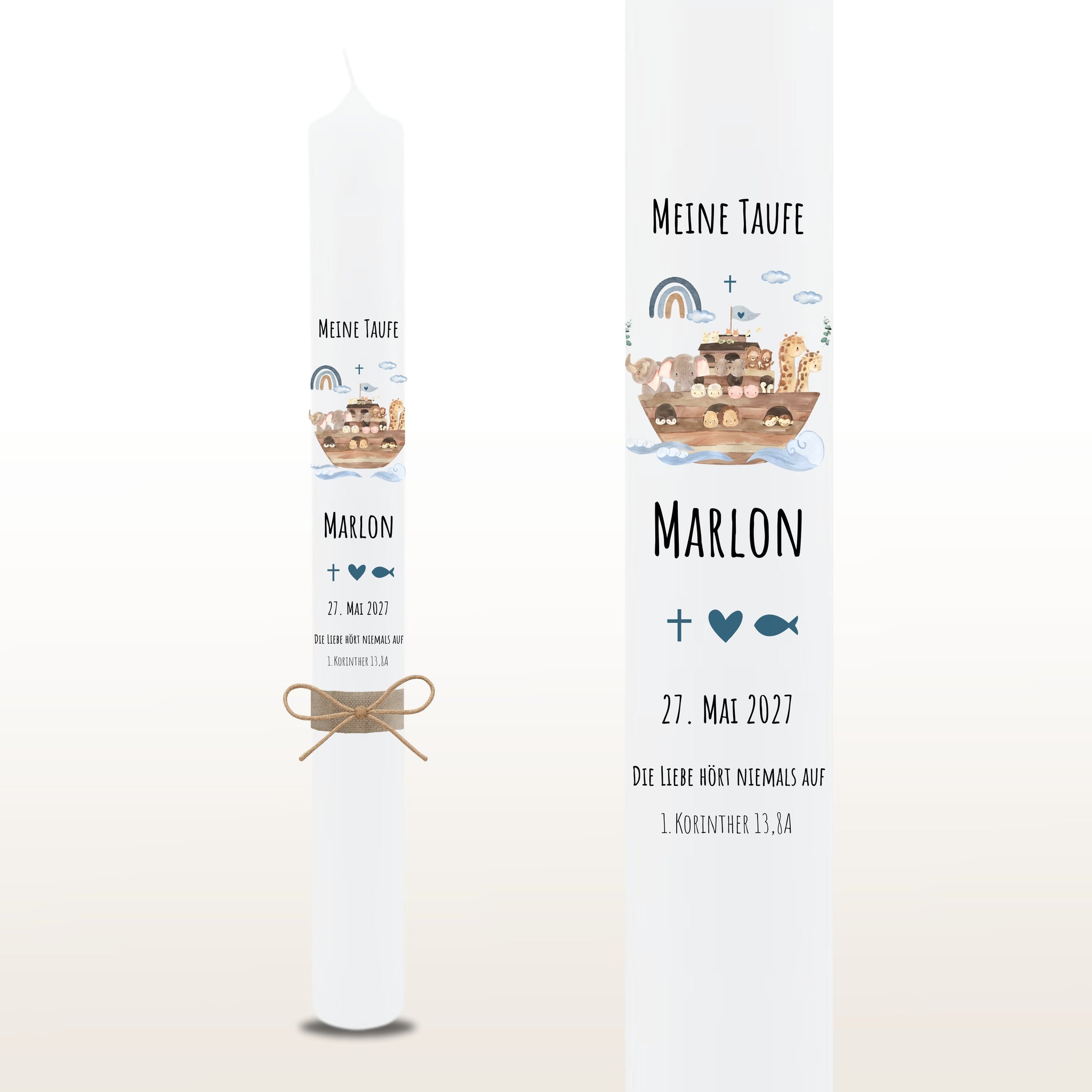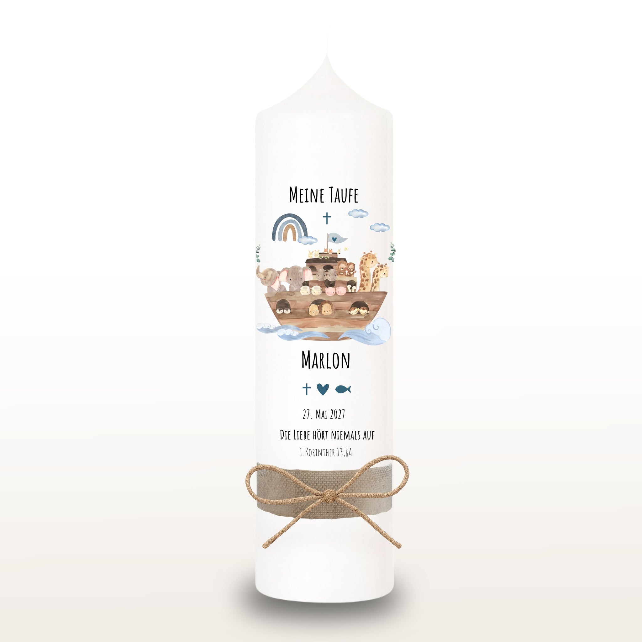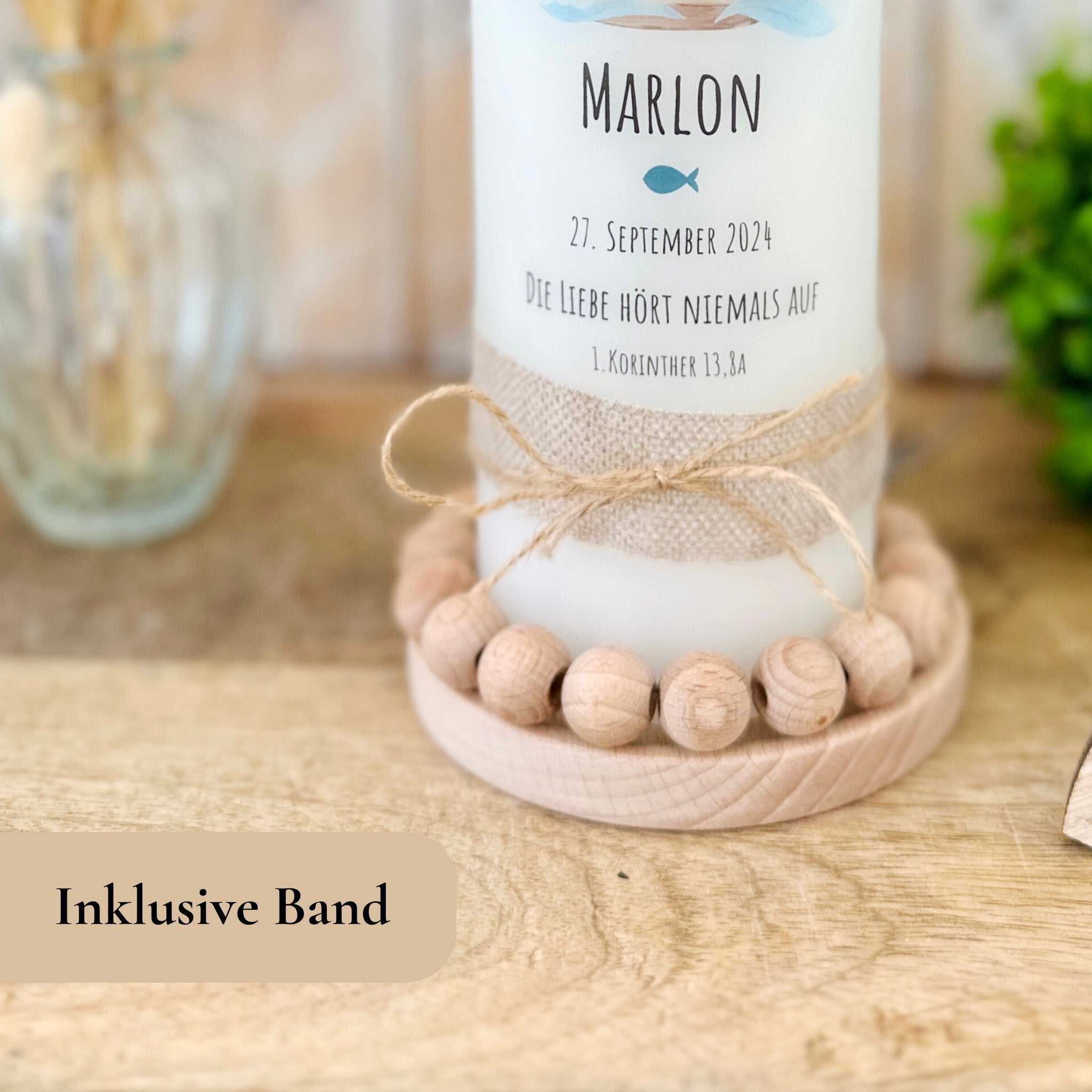 Etsy customer Taufkerze "Marlon" Wal hell blau mit christlichen Symbolen - personalisiert