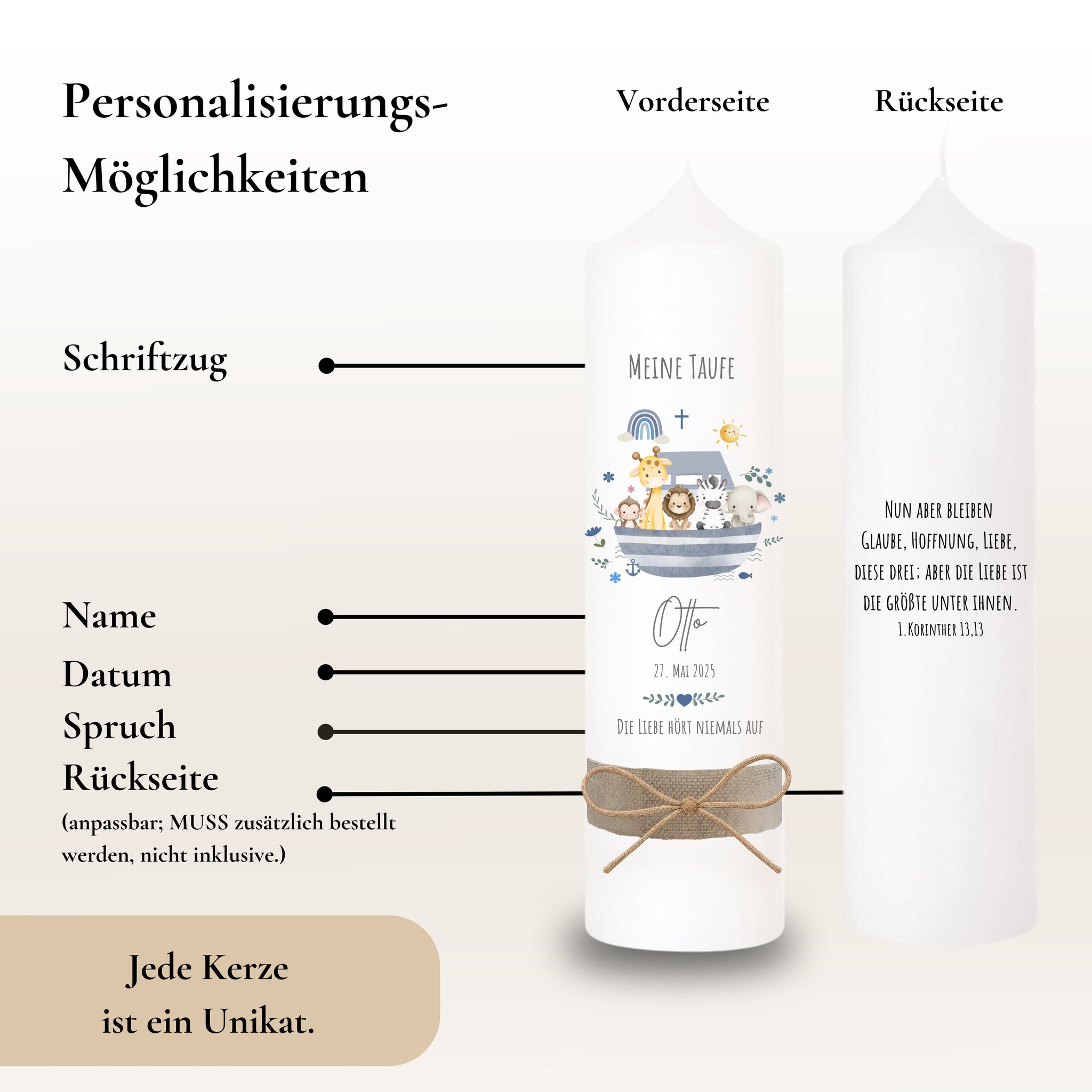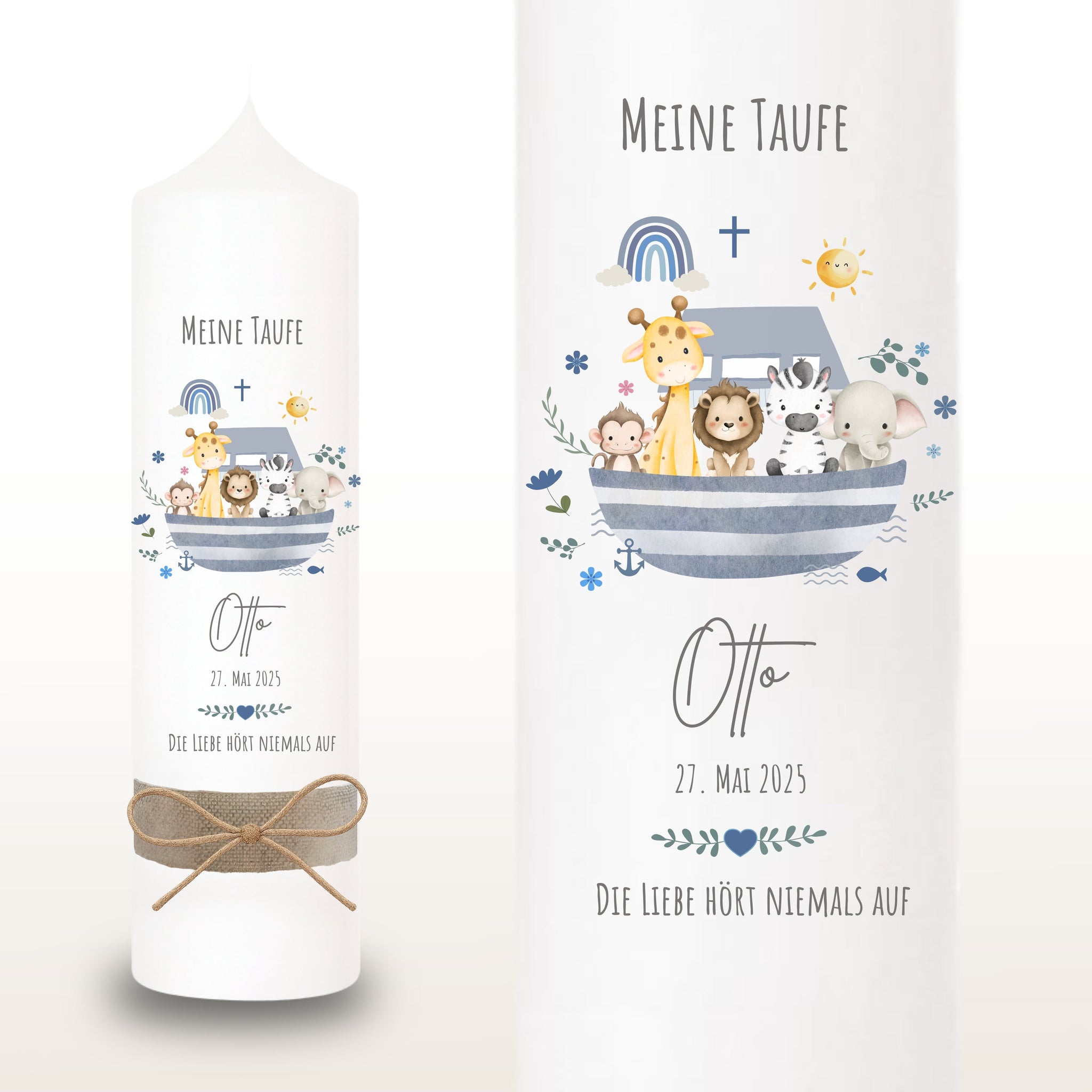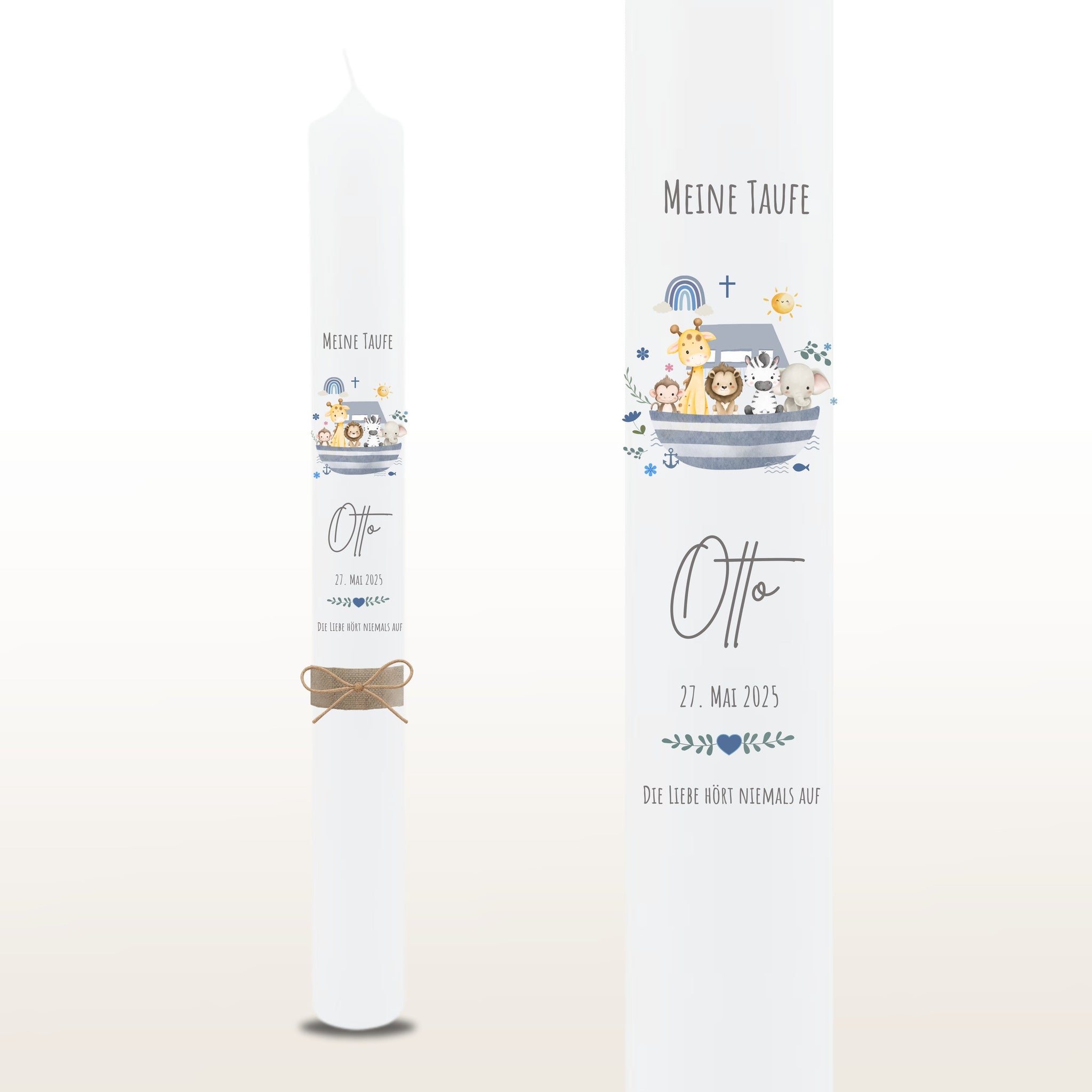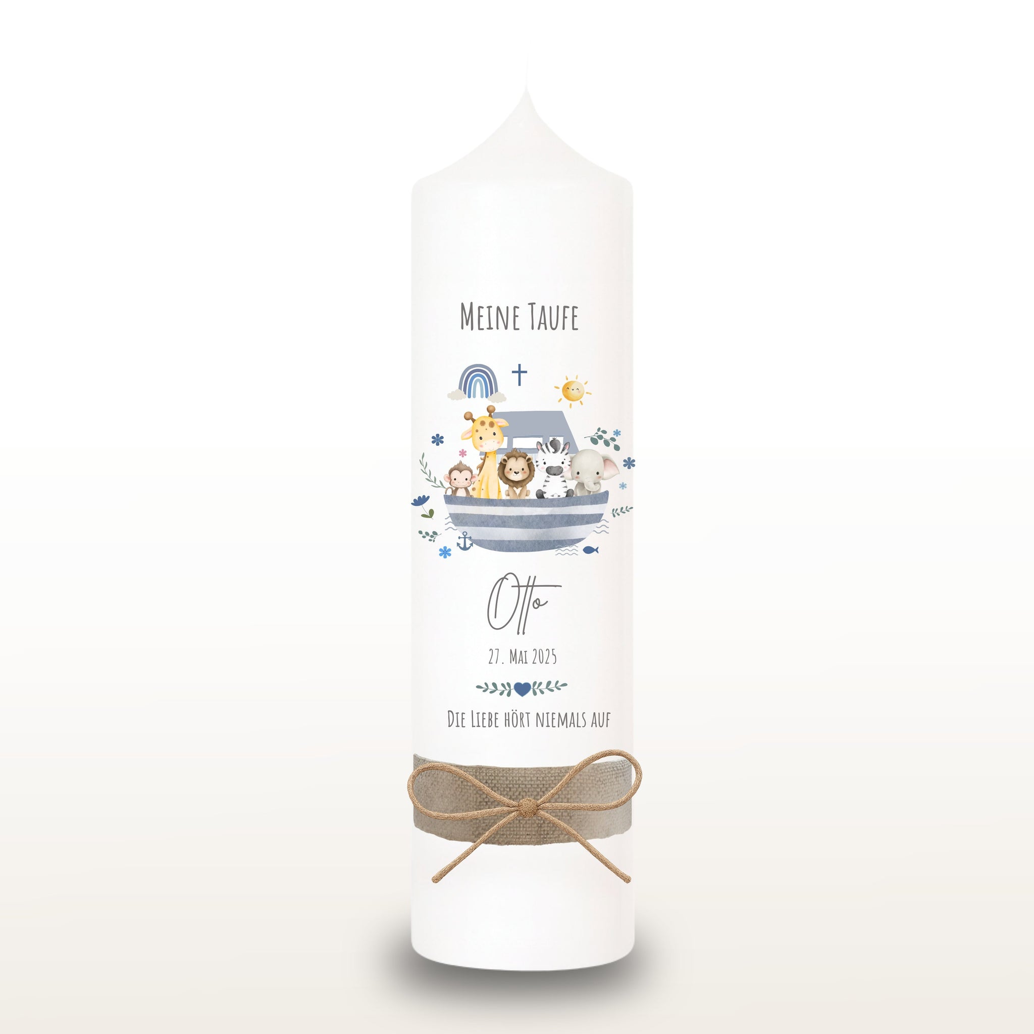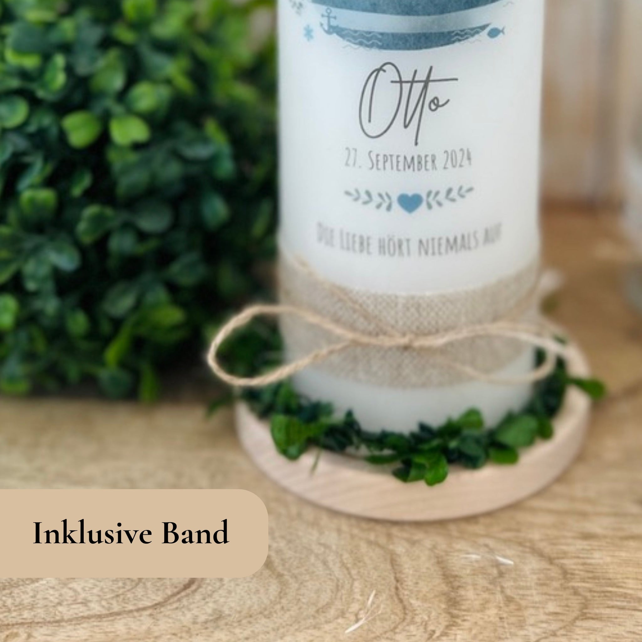 Taufkerze "Otto" Wal hell blau mit christlichen Symbolen - personalisiert