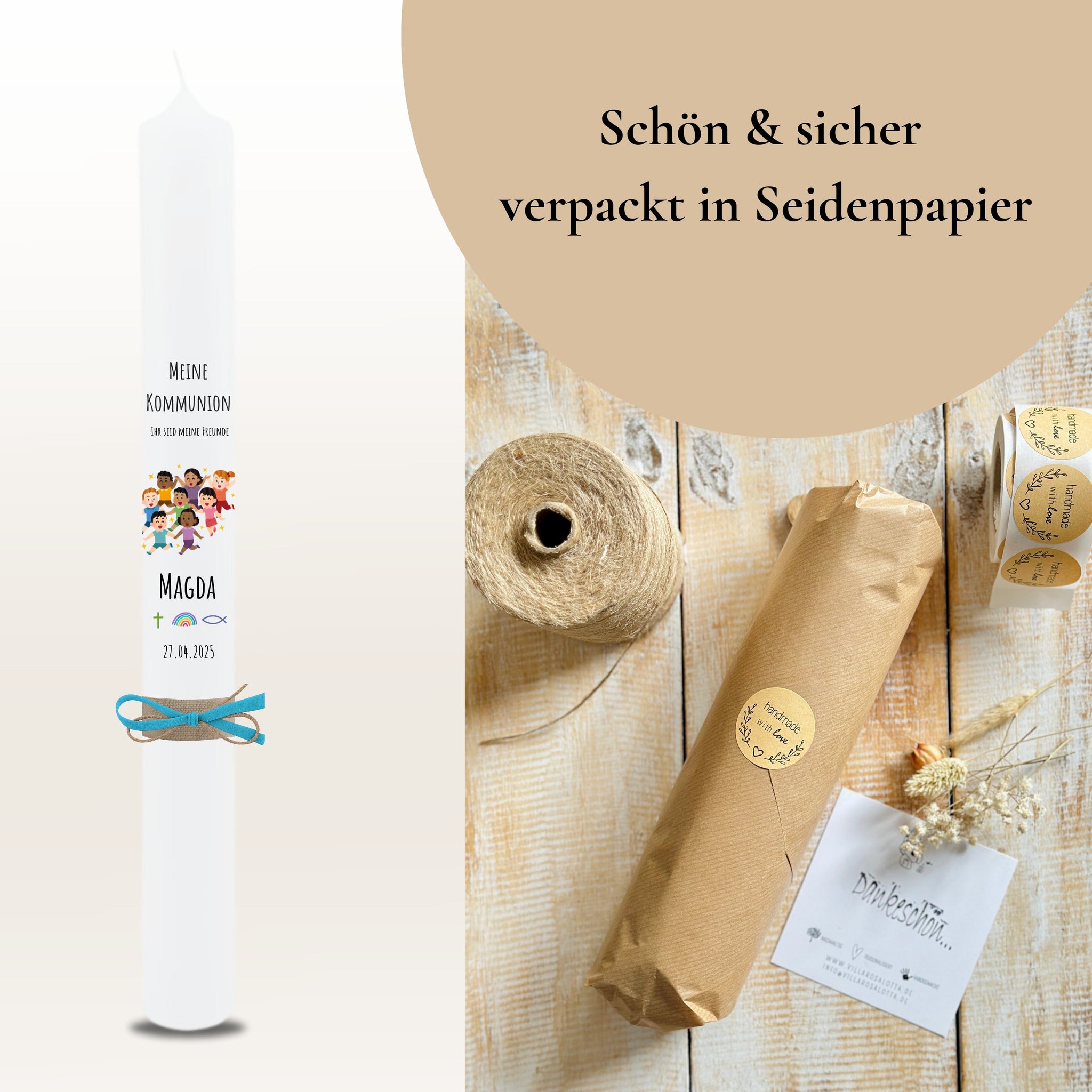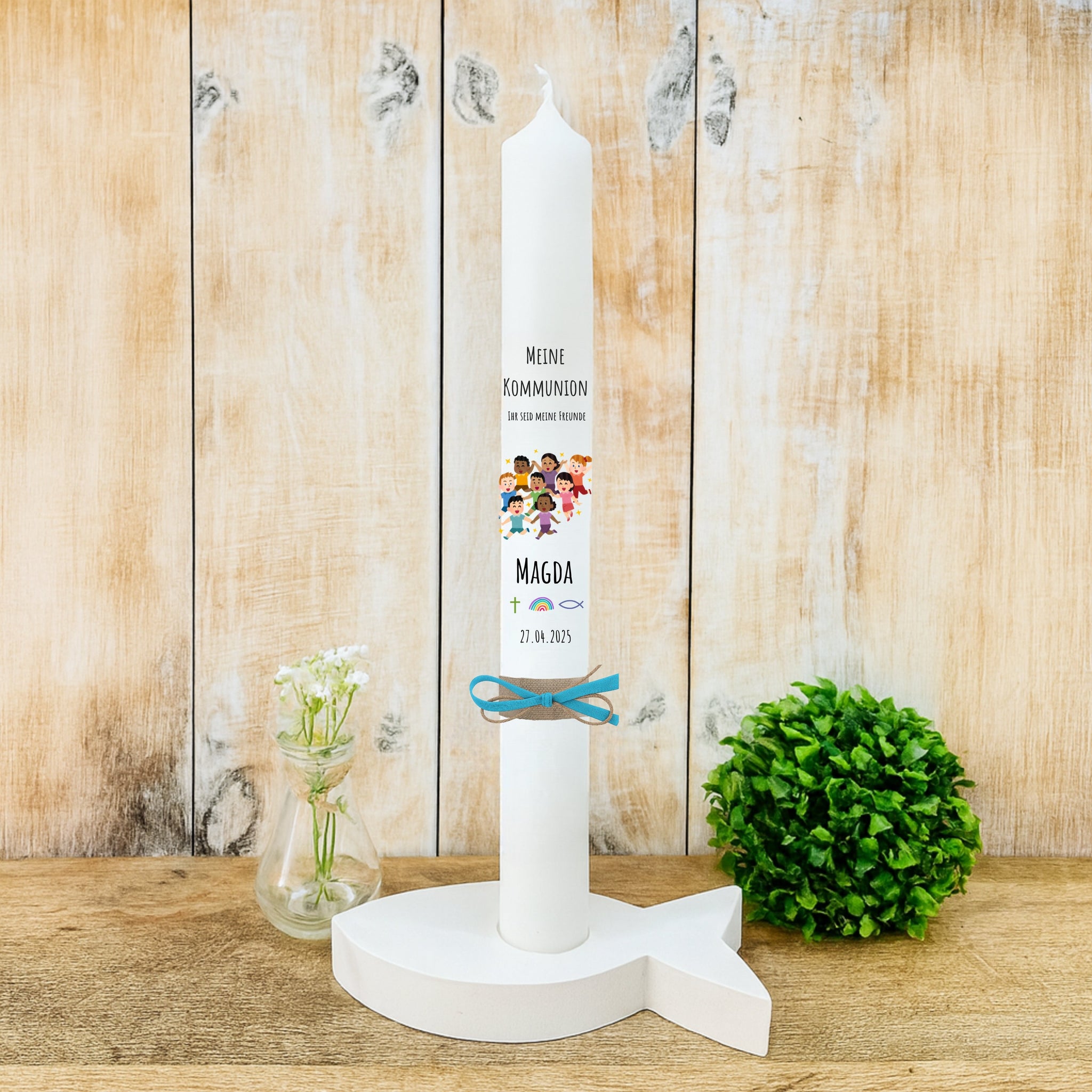Individuelle und personalisierte Kommunionkerzen und Konfirmationskerzen für Jungen und Mädchen mit ausgefallenen Motiven, sowie passendem Zubehör - minimalistisch und modern.