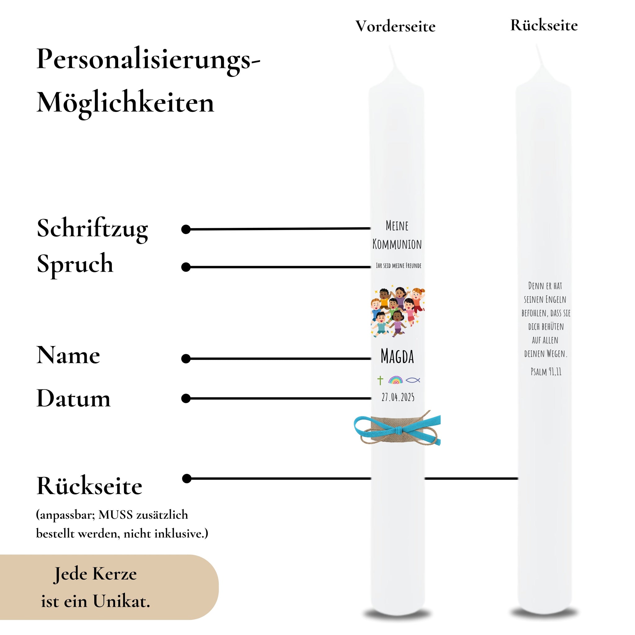 Die Kerzen werden mit viel Liebe zum Detail am PC entworfen & personalisiert, auf Folie gedruckt, „VON HAND“ auf die Kerze gebracht und versiegelt. Dadurch bekommen sie ein schönes Finish und das Motiv ist geschützt!