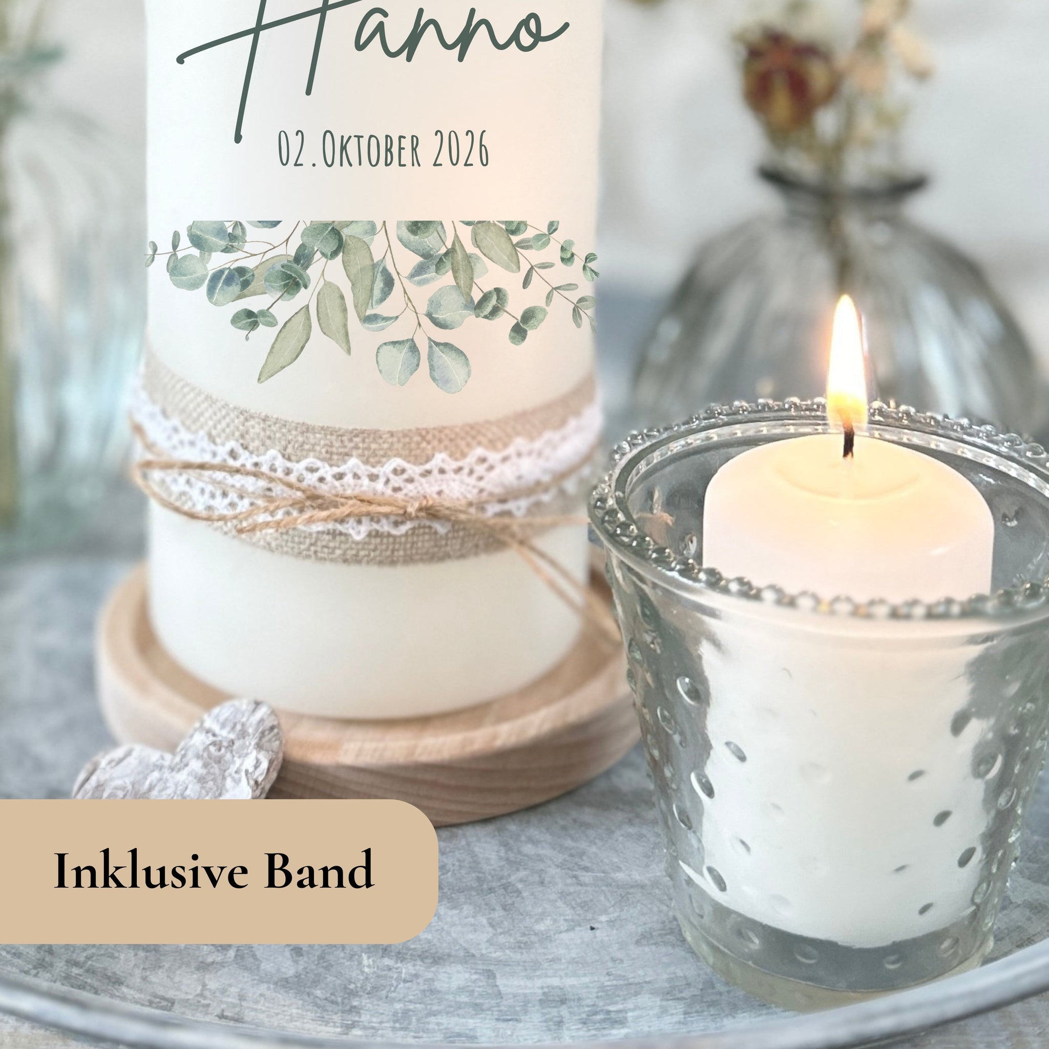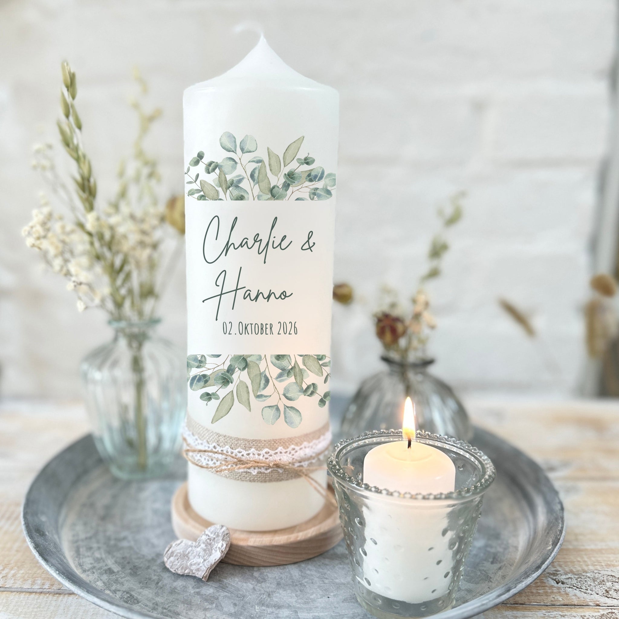 Hochzeitskerze "Charlie" Blätterrahmen grün - personalisiert