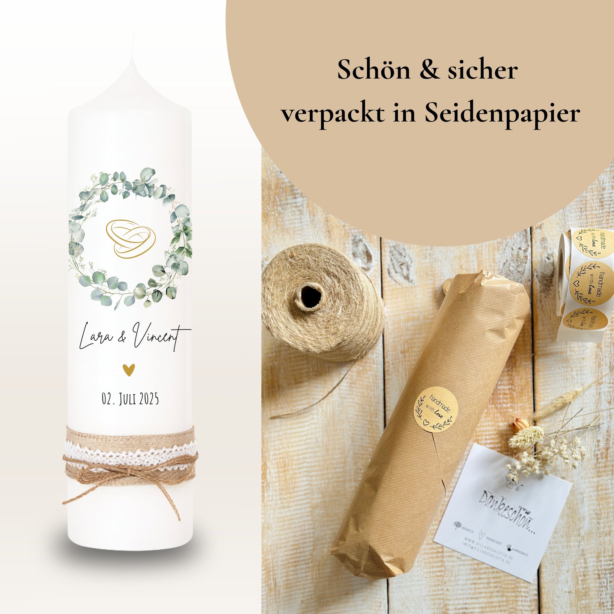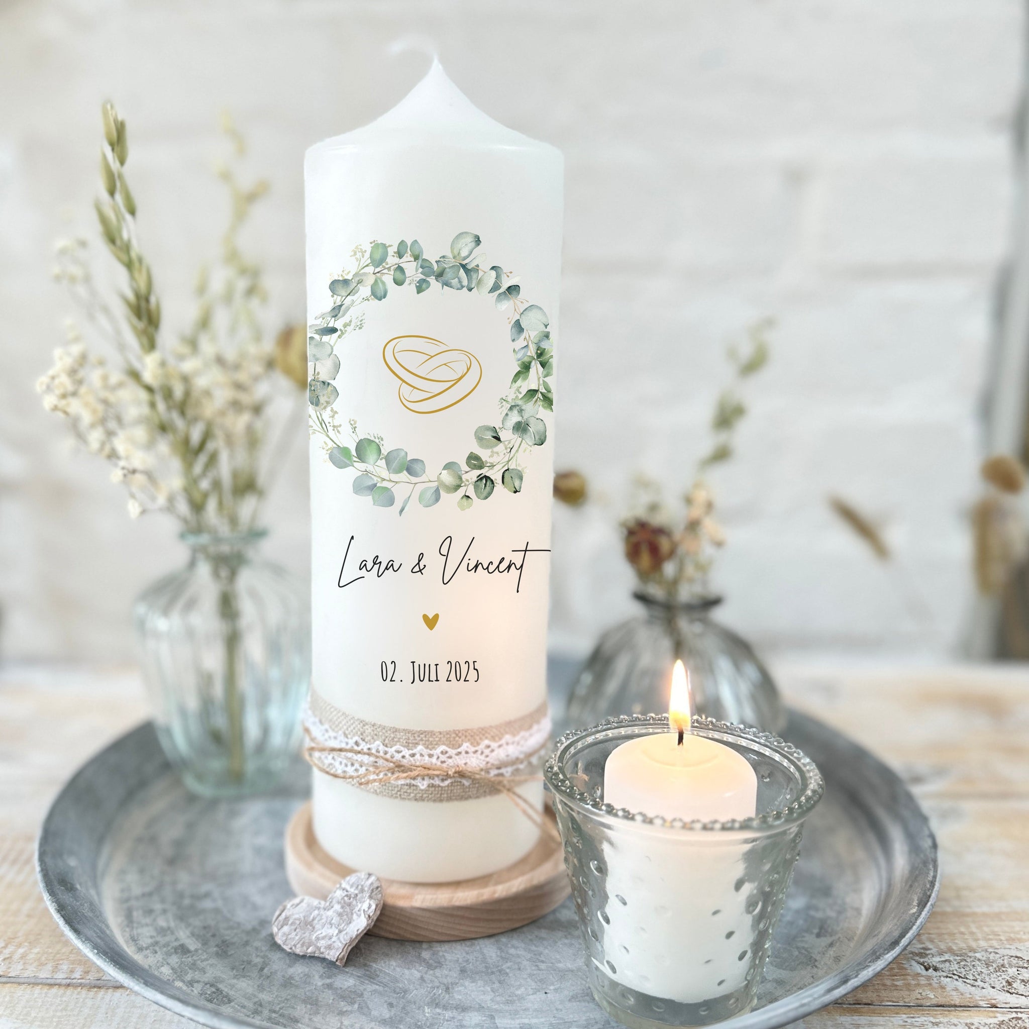 Hochzeitskerze "Lara" Eukalyptuskranz Ringe - personalisiert